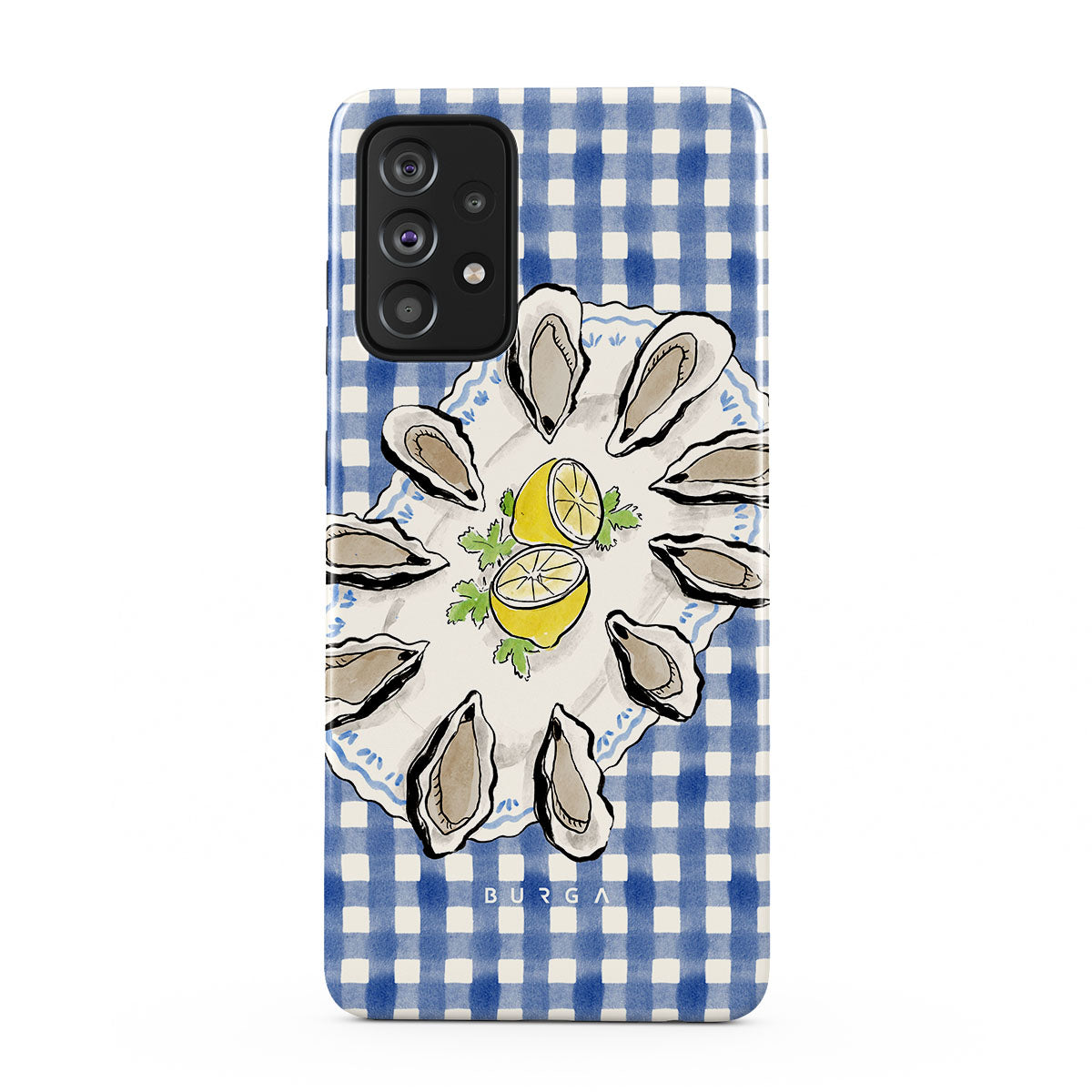 En este diseño: Ostras, limón, cuadros azules, elementos costeros frescos, tonos suaves pastel.