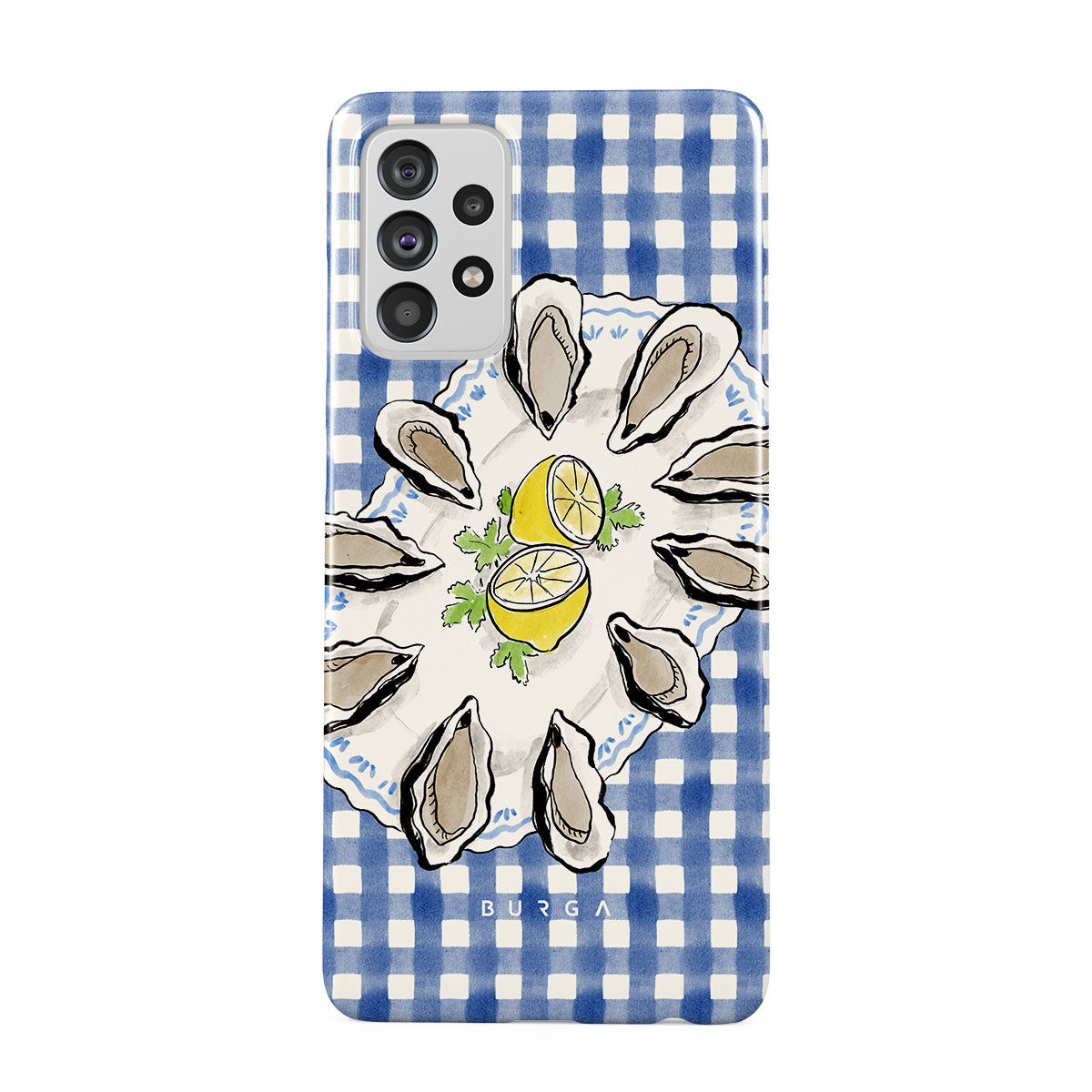En este diseño: Ostras, limón, cuadros azules, elementos costeros frescos, tonos suaves pastel.