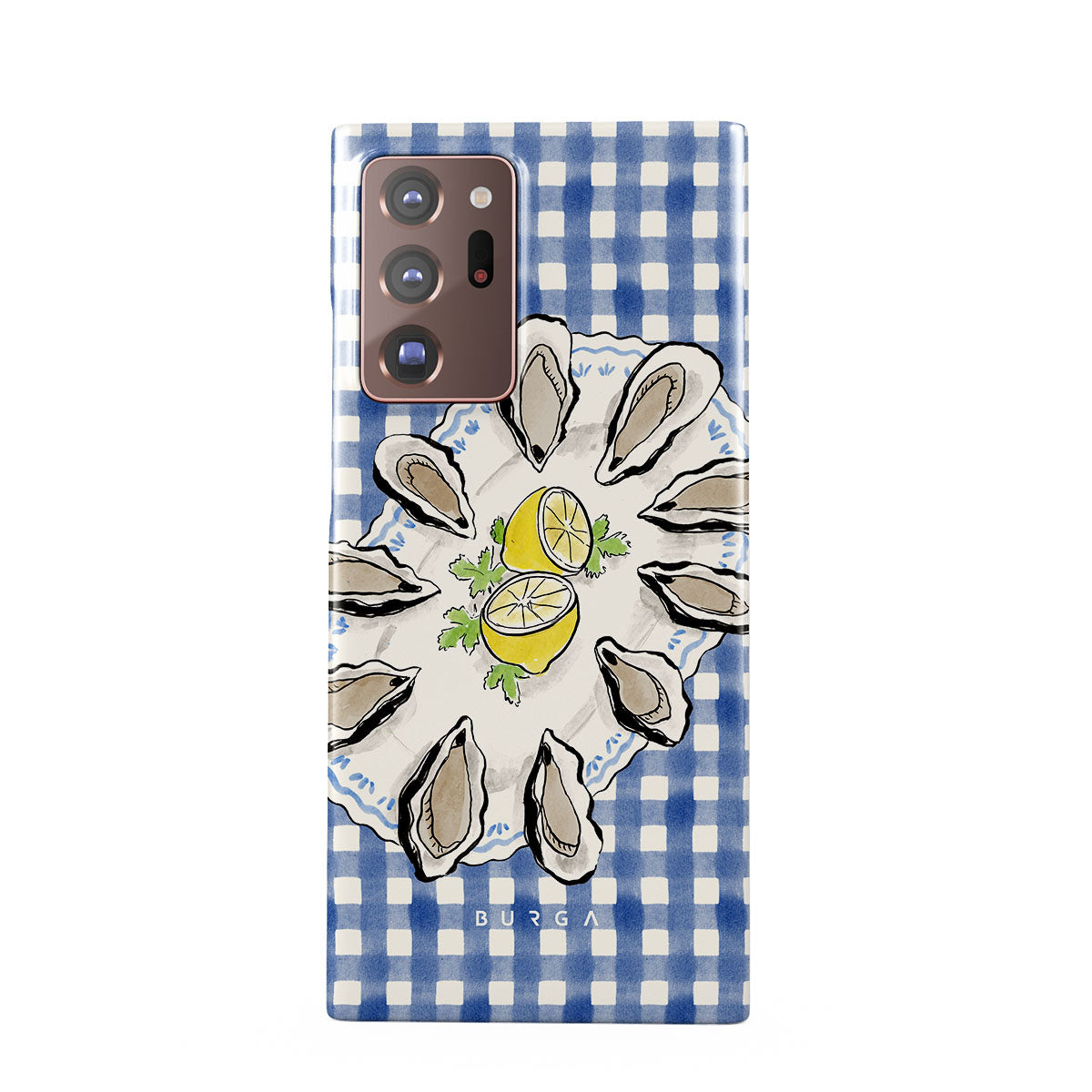 En este diseño: Ostras, limón, cuadros azules, elementos costeros frescos, tonos suaves pastel.