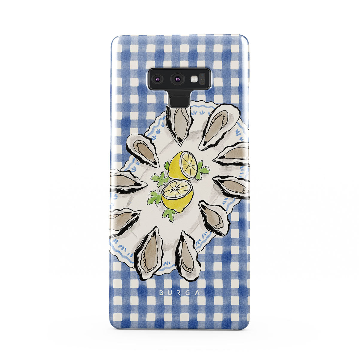En este diseño: Ostras, limón, cuadros azules, elementos costeros frescos, tonos suaves pastel.