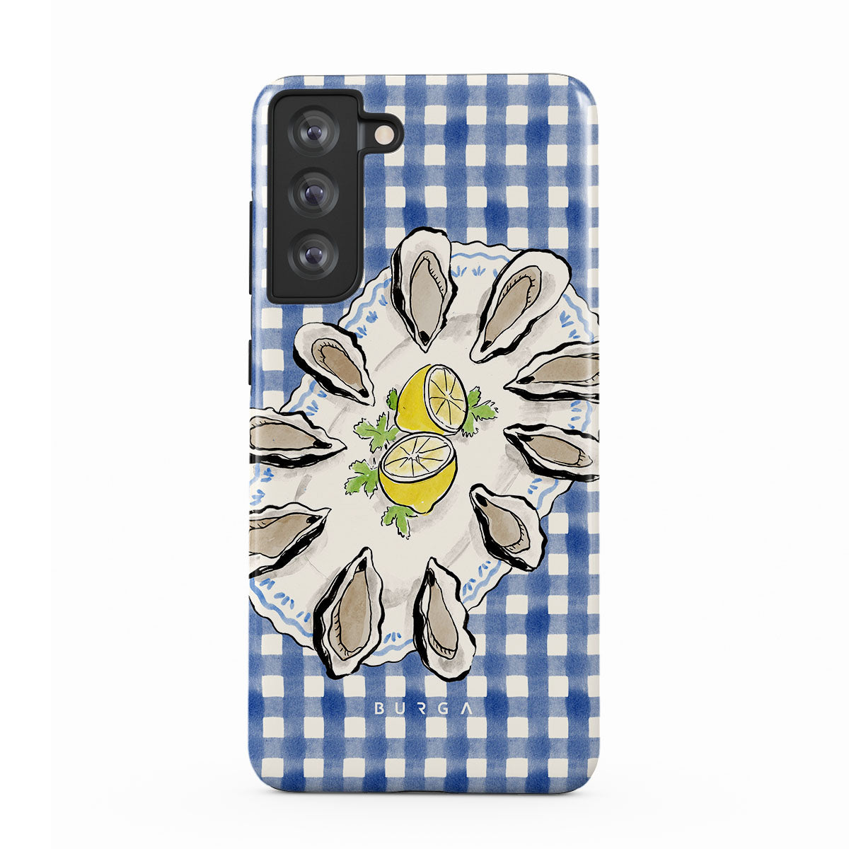 En este diseño: Ostras, limón, cuadros azules, elementos costeros frescos, tonos suaves pastel.