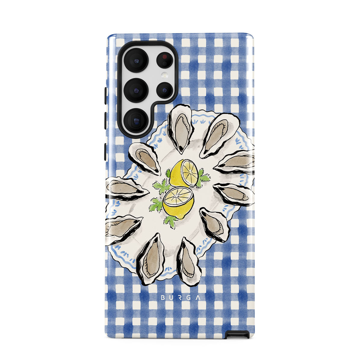 En este diseño: Ostras, limón, cuadros azules, elementos costeros frescos, tonos suaves pastel.