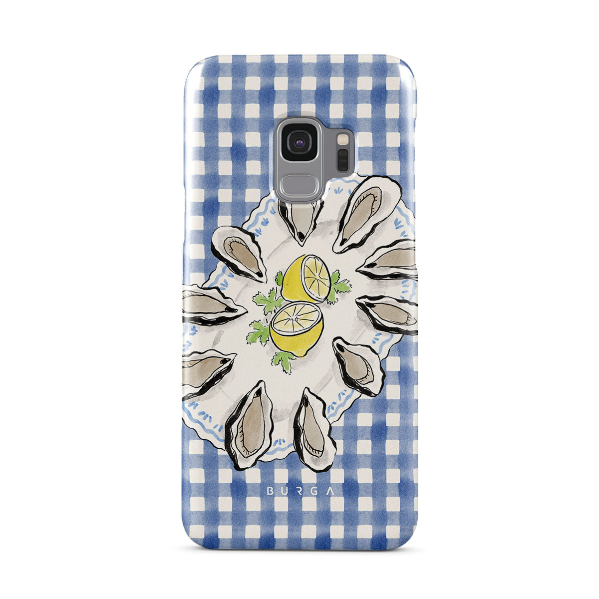 En este diseño: Ostras, limón, cuadros azules, elementos costeros frescos, tonos suaves pastel.