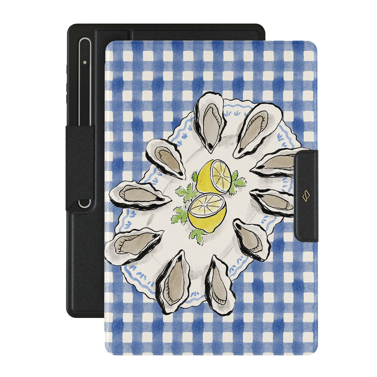 En este diseño: Ostras, limón, cuadros azules, elementos costeros frescos, tonos suaves pastel.