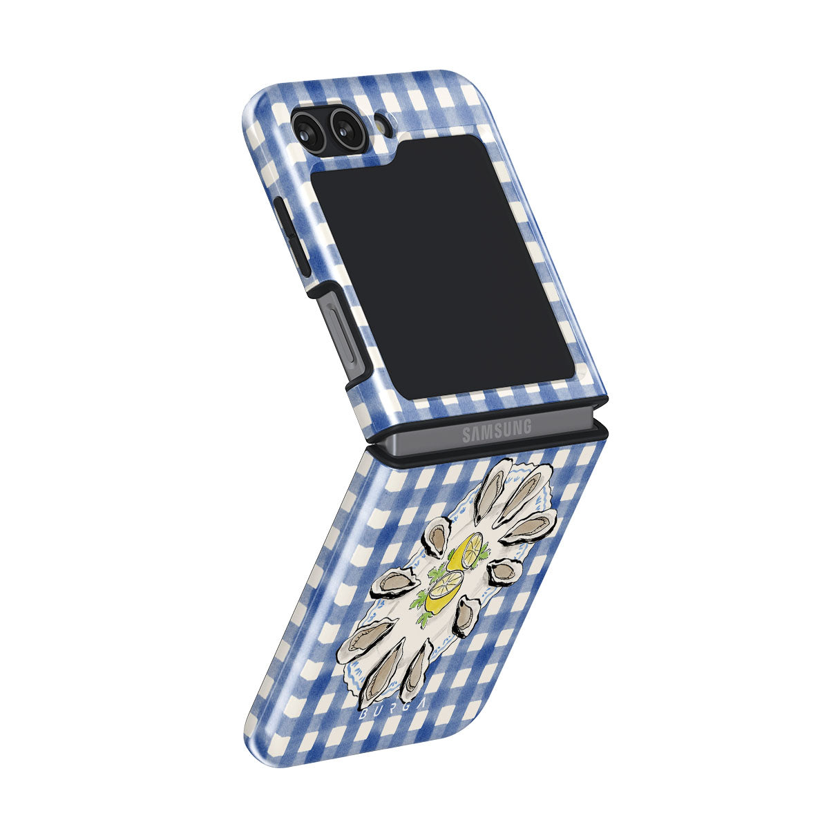 En este diseño: Ostras, limón, cuadros azules, elementos costeros frescos, tonos suaves pastel.