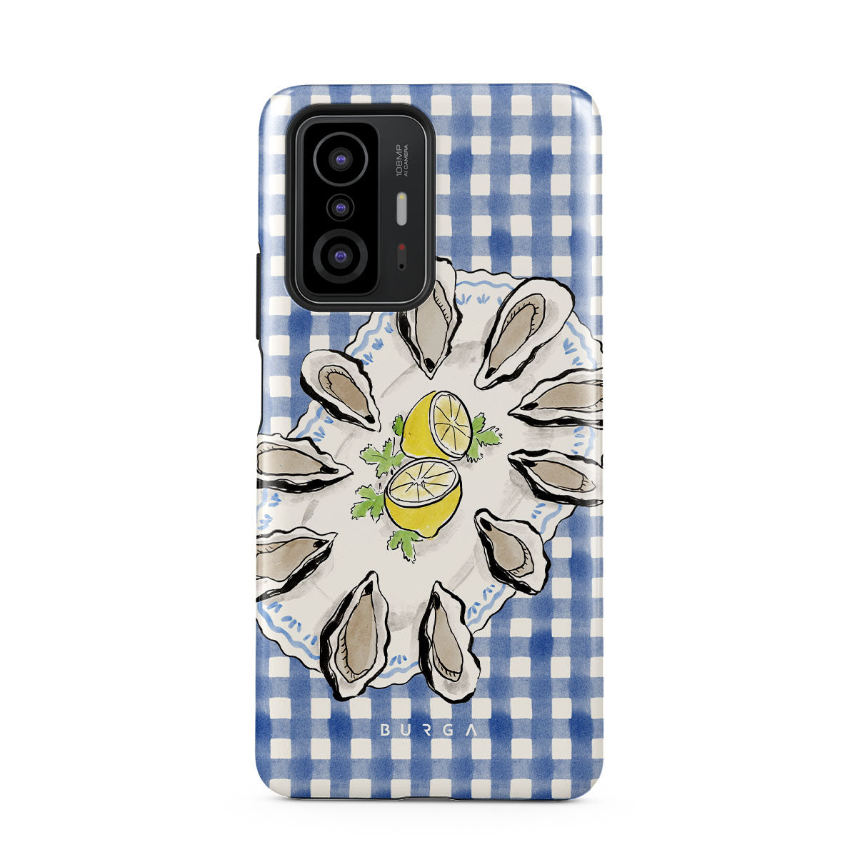 En este diseño: Ostras, limón, cuadros azules, elementos costeros frescos, tonos suaves pastel.