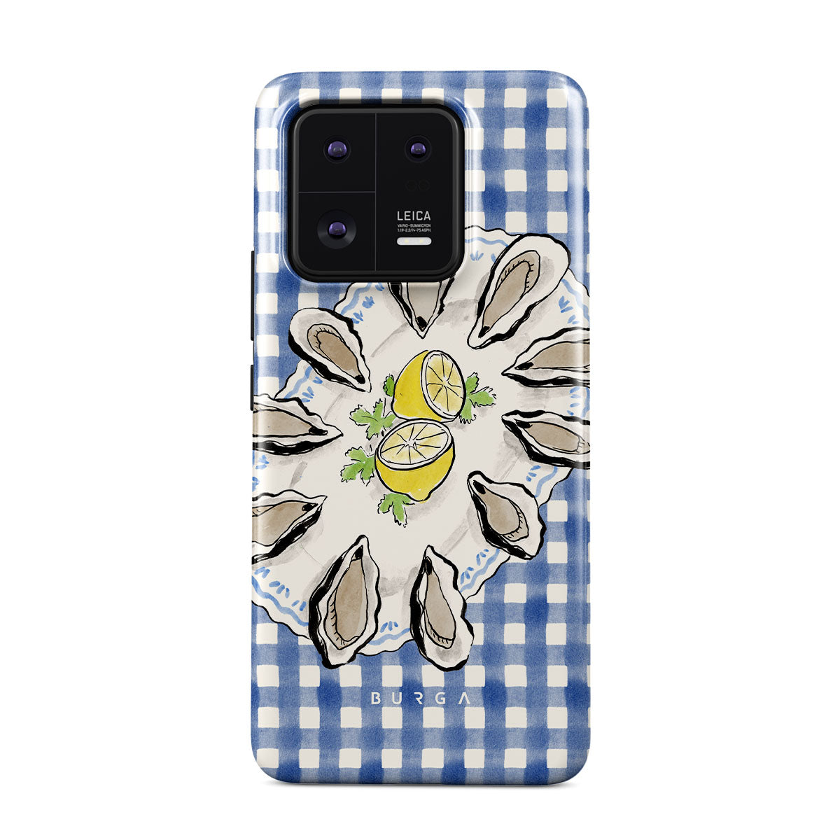 En este diseño: Ostras, limón, cuadros azules, elementos costeros frescos, tonos suaves pastel.