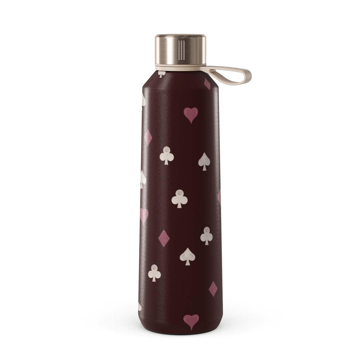 En este diseño: palos de cartas, corazones, picas, diamantes, tréboles, fondo burdeos