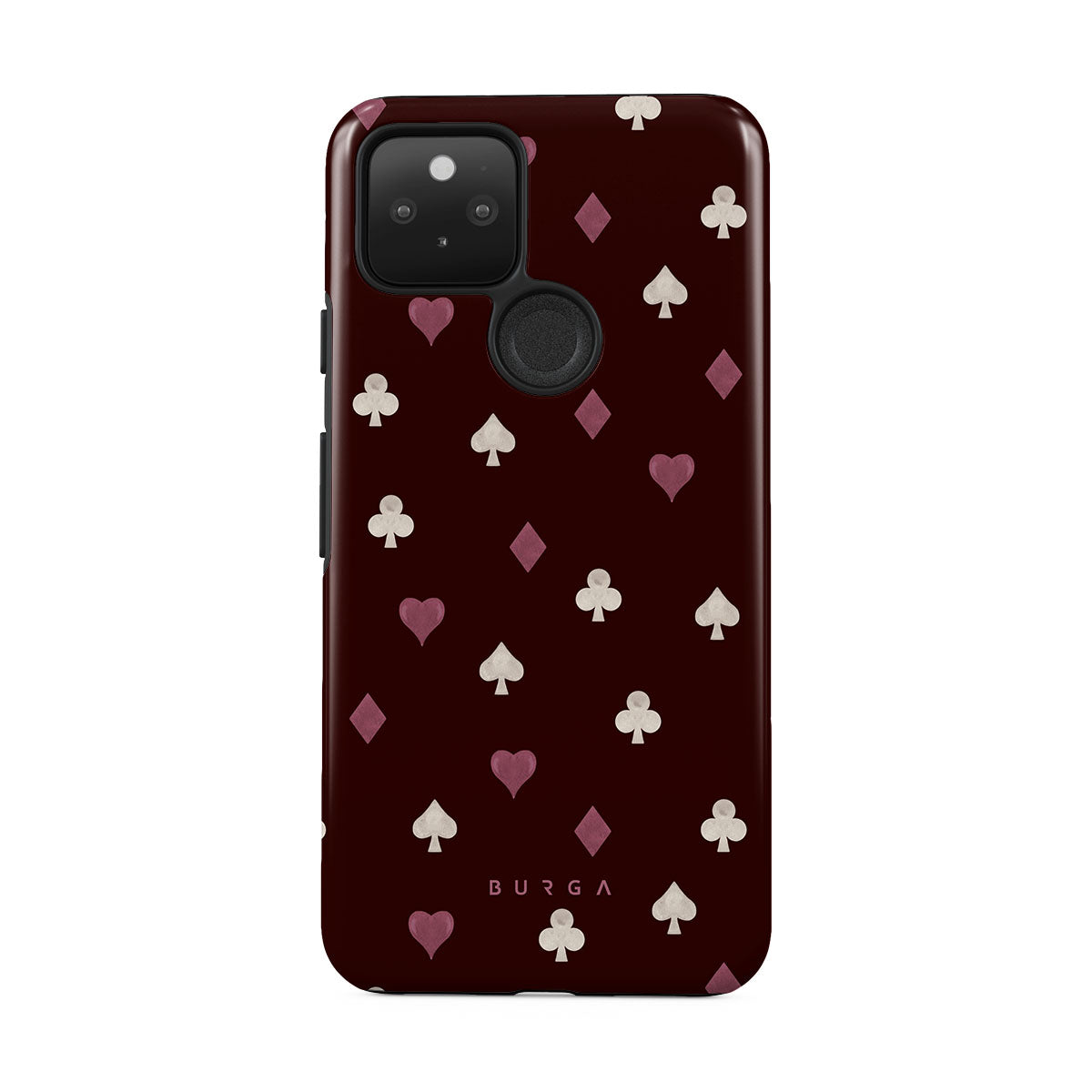 En este diseño: palos de cartas, corazones, picas, diamantes, tréboles, fondo burdeos