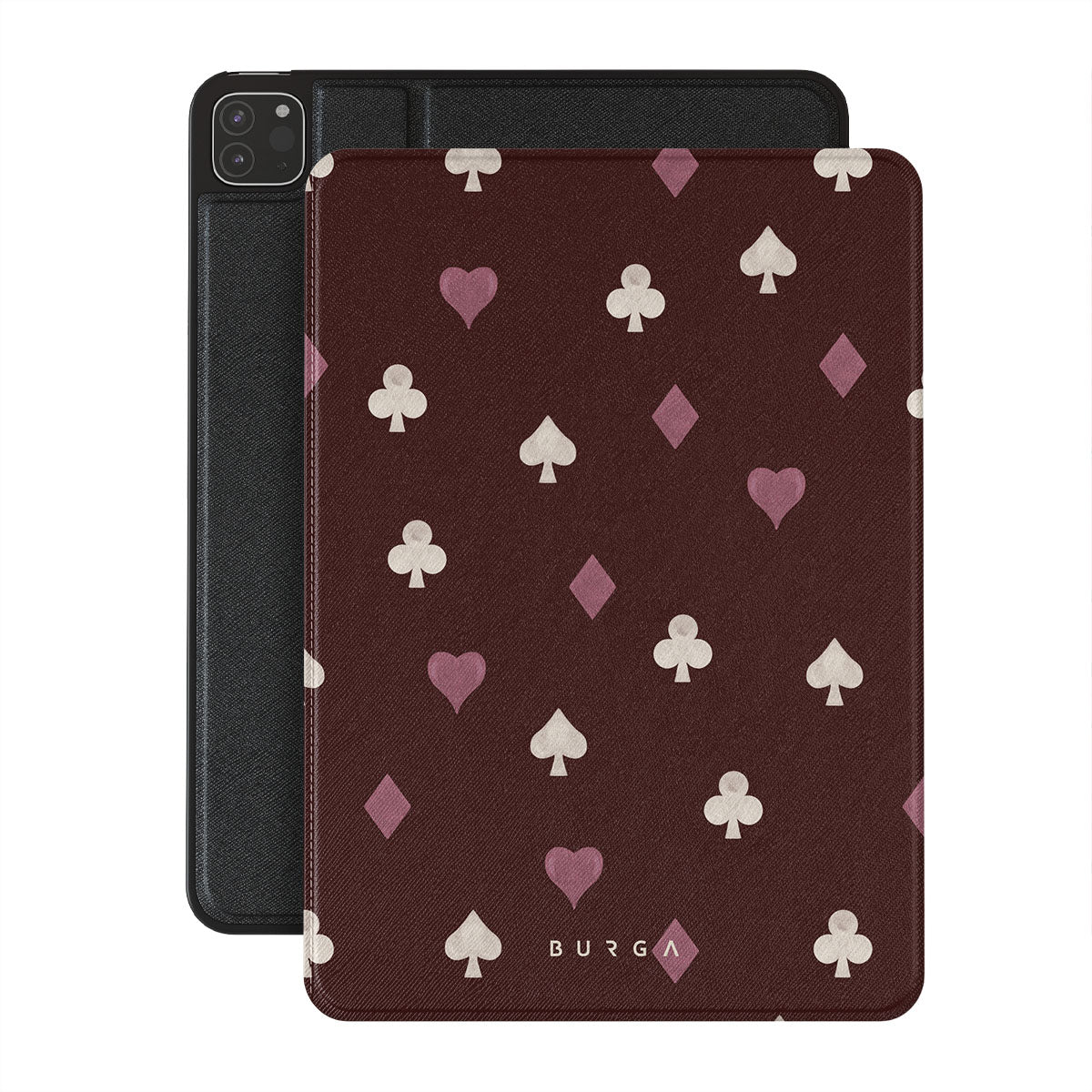 En este diseño: palos de cartas, corazones, picas, diamantes, tréboles, fondo burdeos