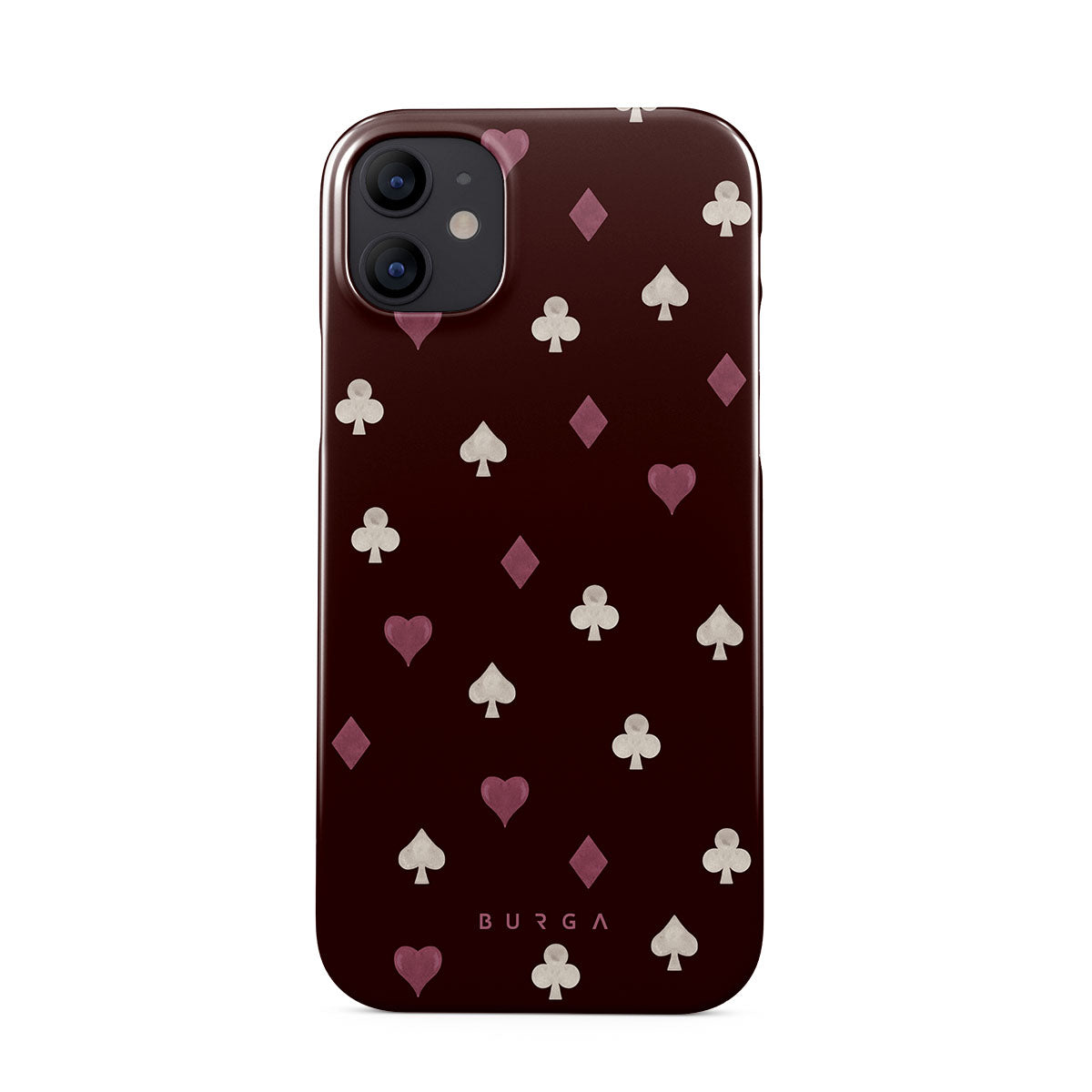 En este diseño: palos de cartas, corazones, picas, diamantes, tréboles, fondo burdeos