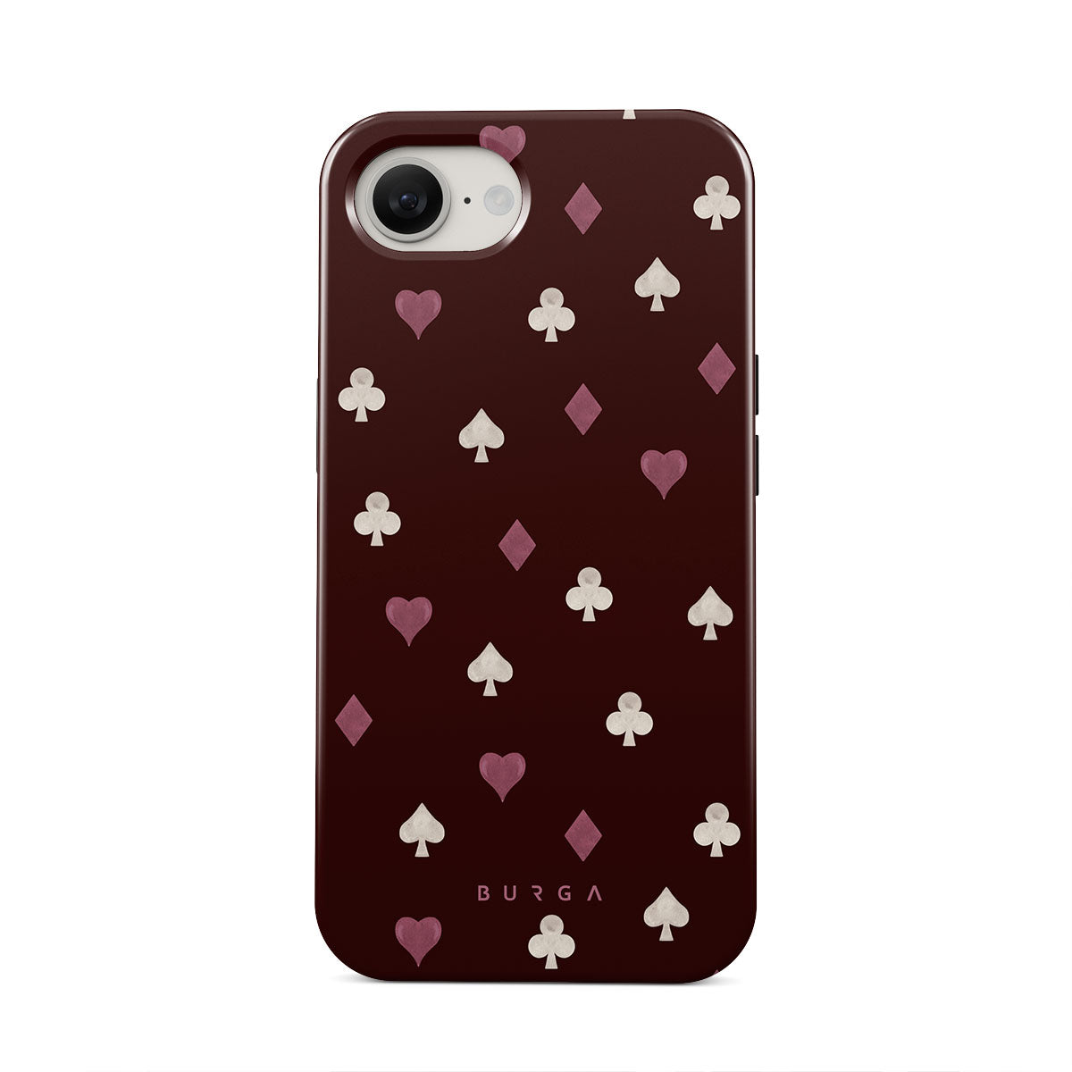 En este diseño: palos de cartas, corazones, picas, diamantes, tréboles, fondo burdeos