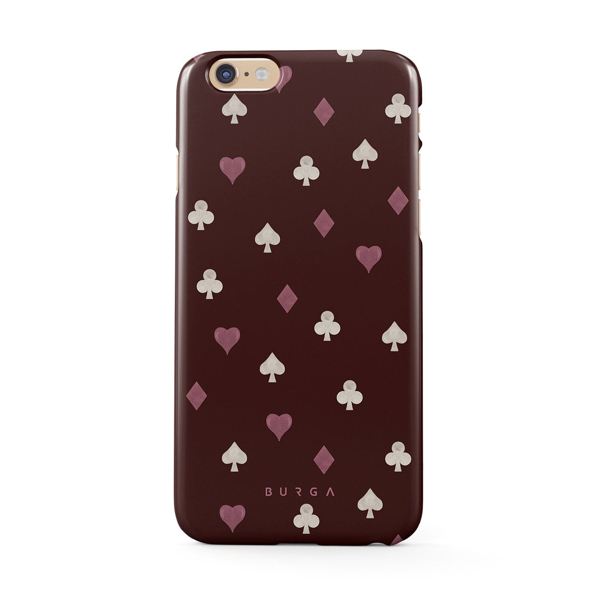 En este diseño: palos de cartas, corazones, picas, diamantes, tréboles, fondo burdeos