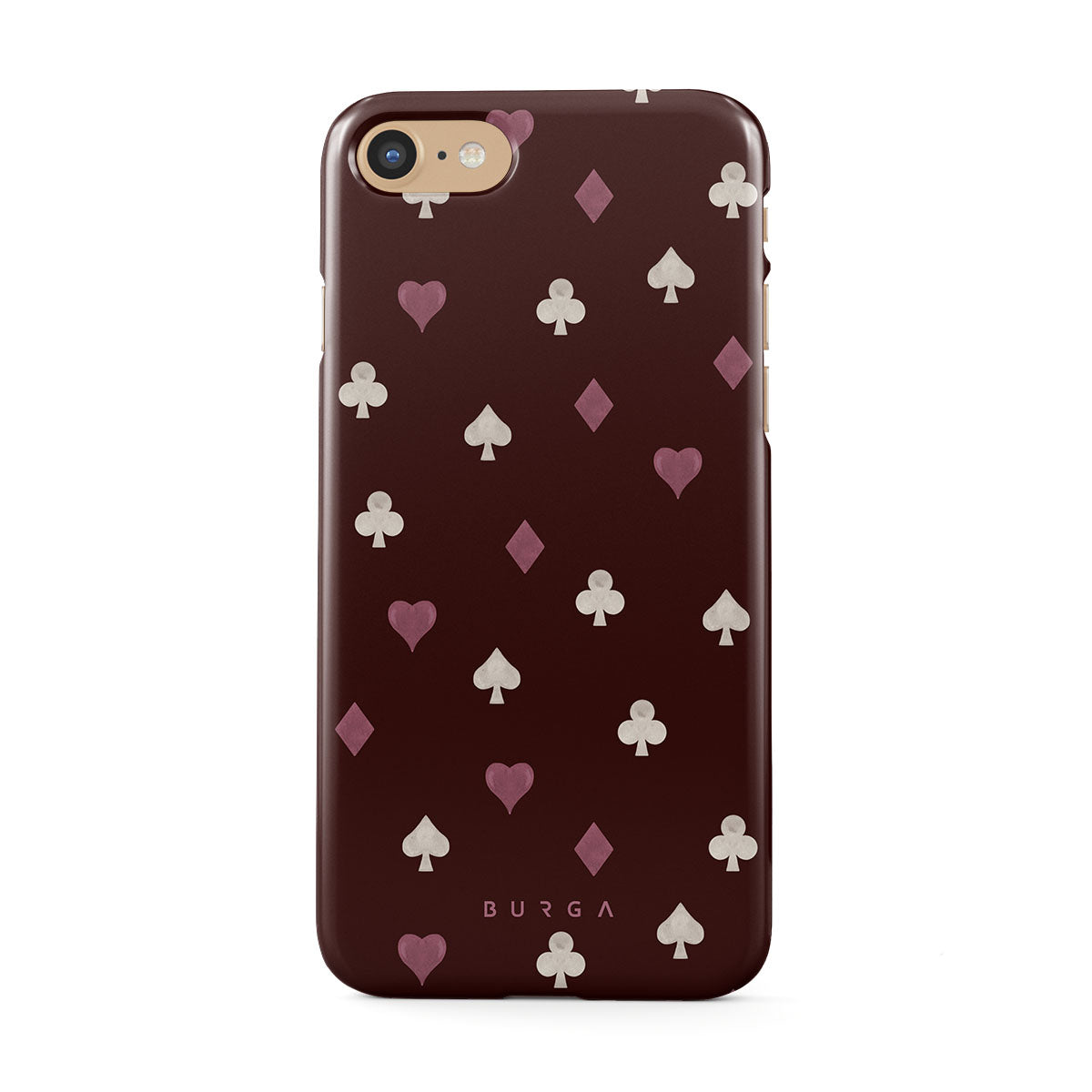 En este diseño: palos de cartas, corazones, picas, diamantes, tréboles, fondo burdeos
