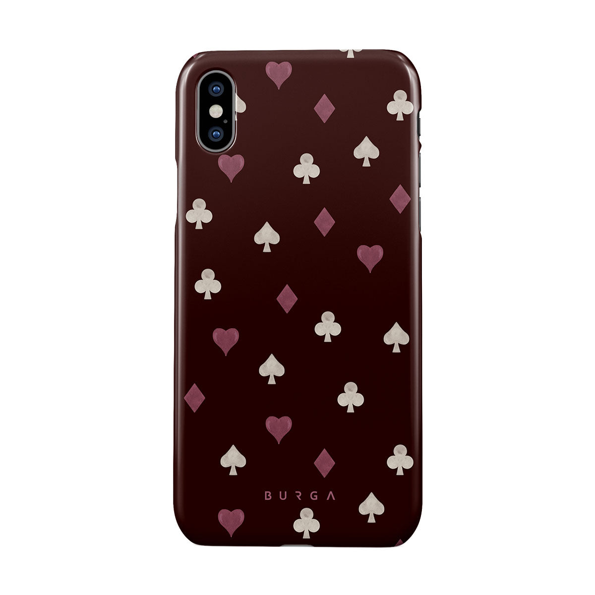 En este diseño: palos de cartas, corazones, picas, diamantes, tréboles, fondo burdeos