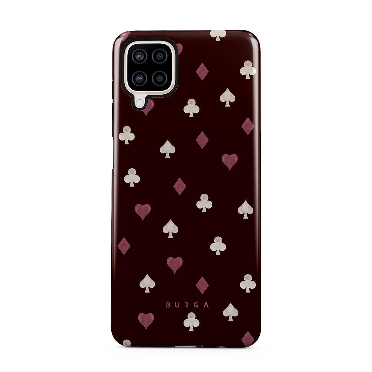 En este diseño: palos de cartas, corazones, picas, diamantes, tréboles, fondo burdeos