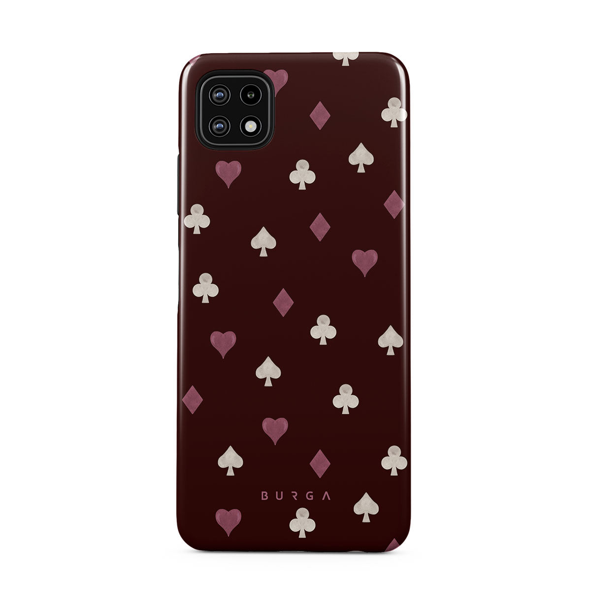En este diseño: palos de cartas, corazones, picas, diamantes, tréboles, fondo burdeos