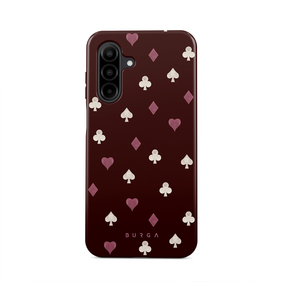 En este diseño: palos de cartas, corazones, picas, diamantes, tréboles, fondo burdeos