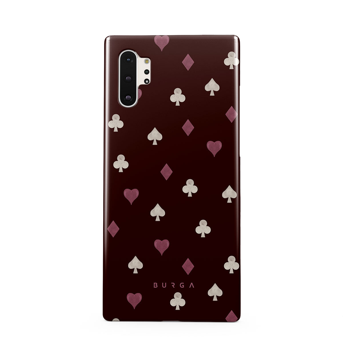 En este diseño: palos de cartas, corazones, picas, diamantes, tréboles, fondo burdeos