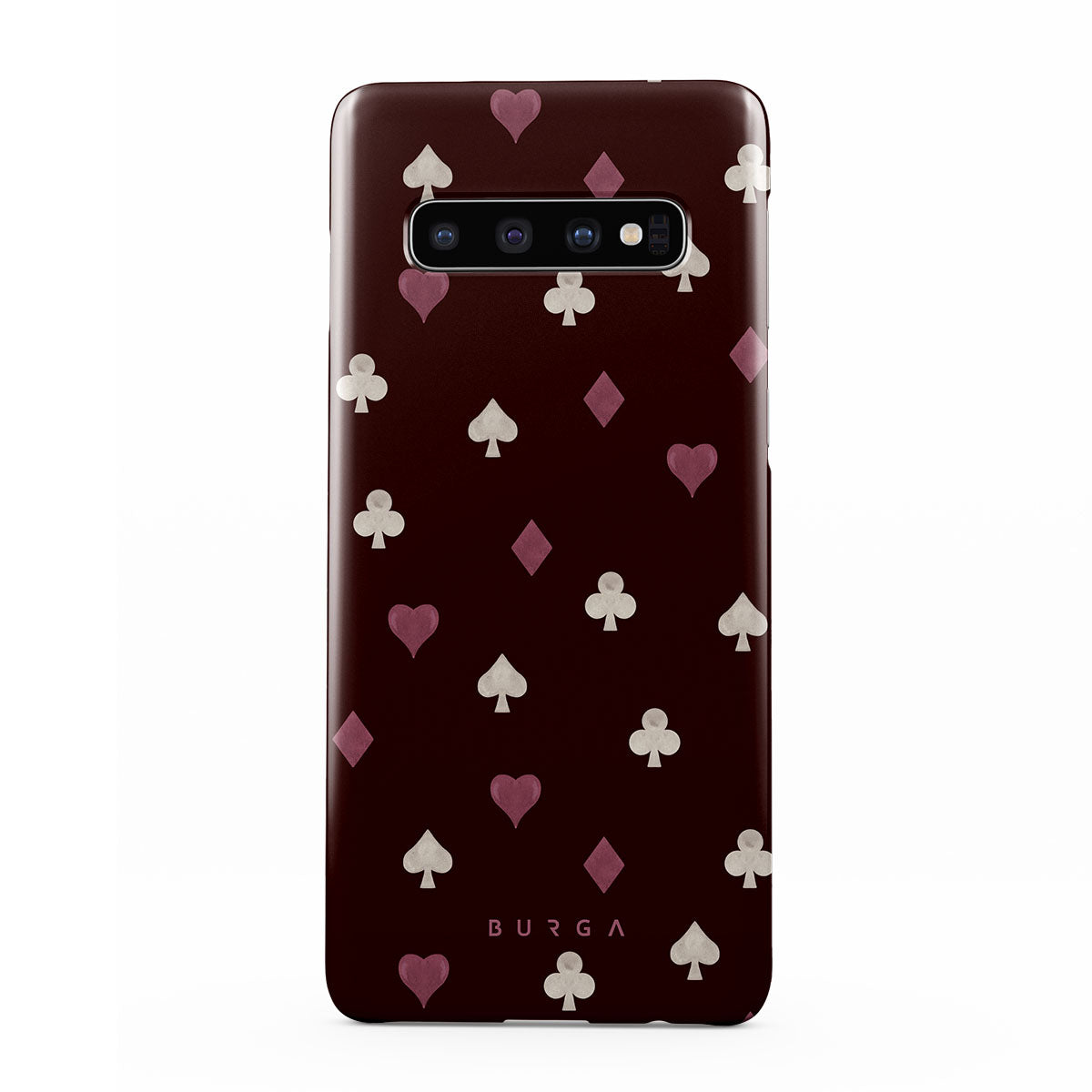 En este diseño: palos de cartas, corazones, picas, diamantes, tréboles, fondo burdeos