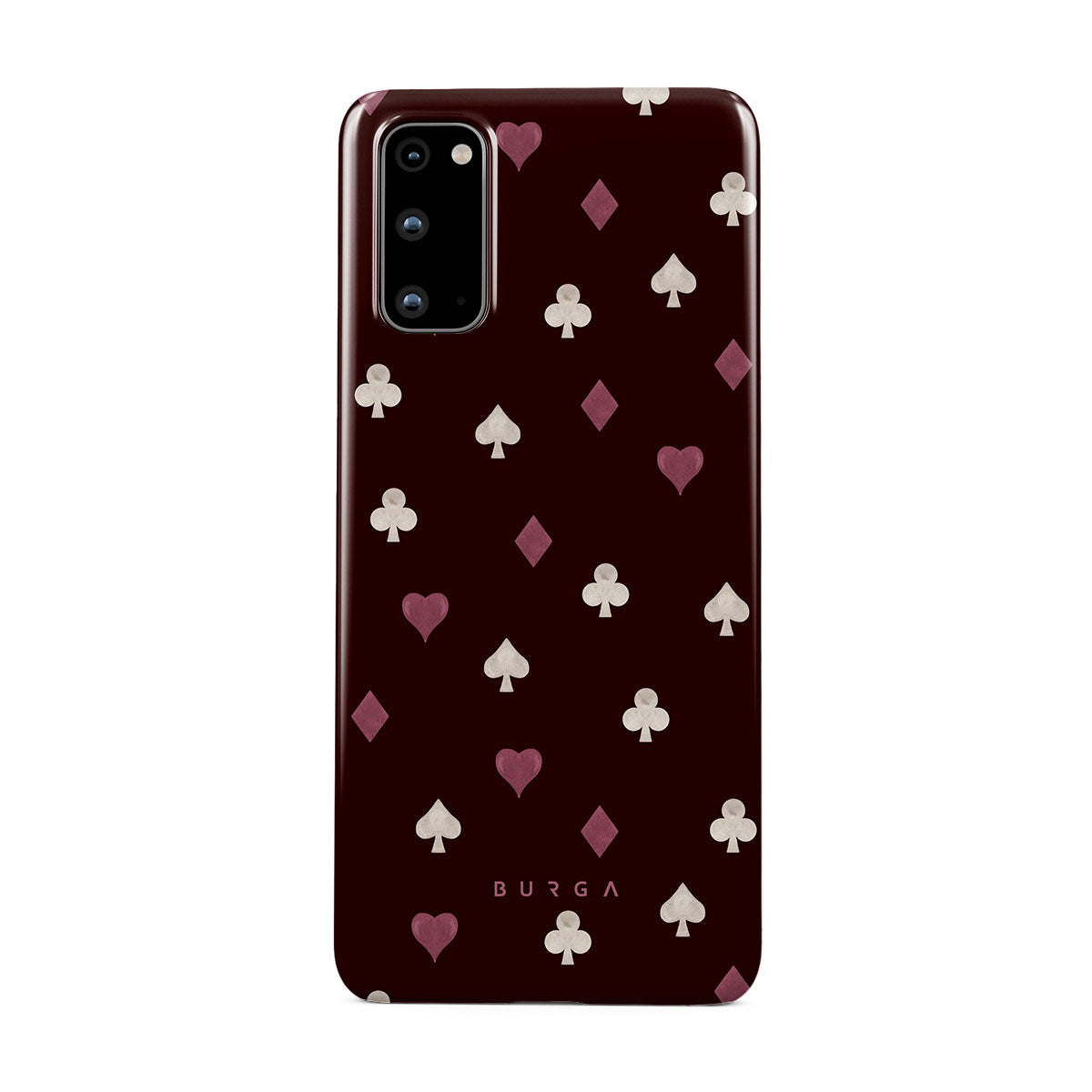 En este diseño: palos de cartas, corazones, picas, diamantes, tréboles, fondo burdeos