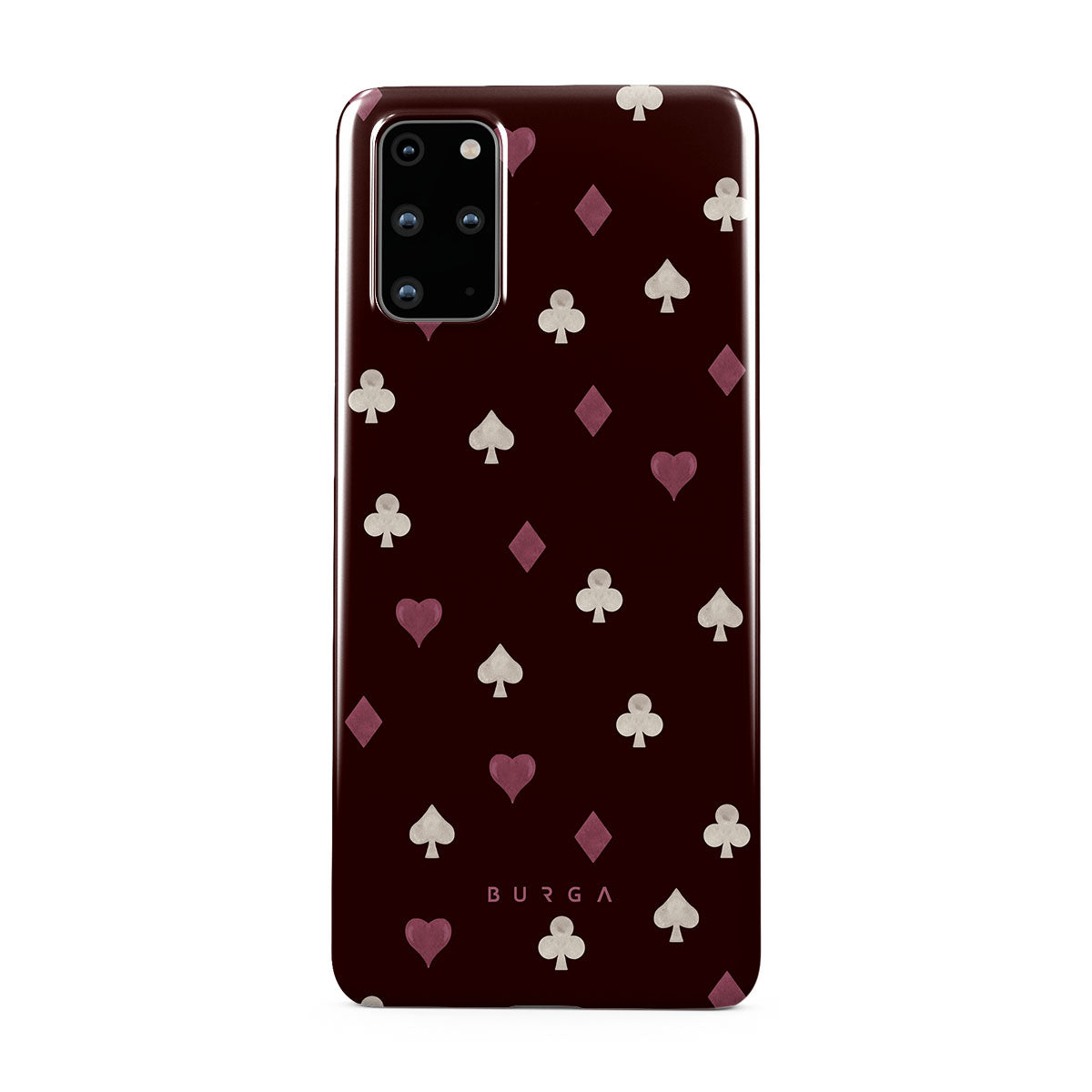 En este diseño: palos de cartas, corazones, picas, diamantes, tréboles, fondo burdeos