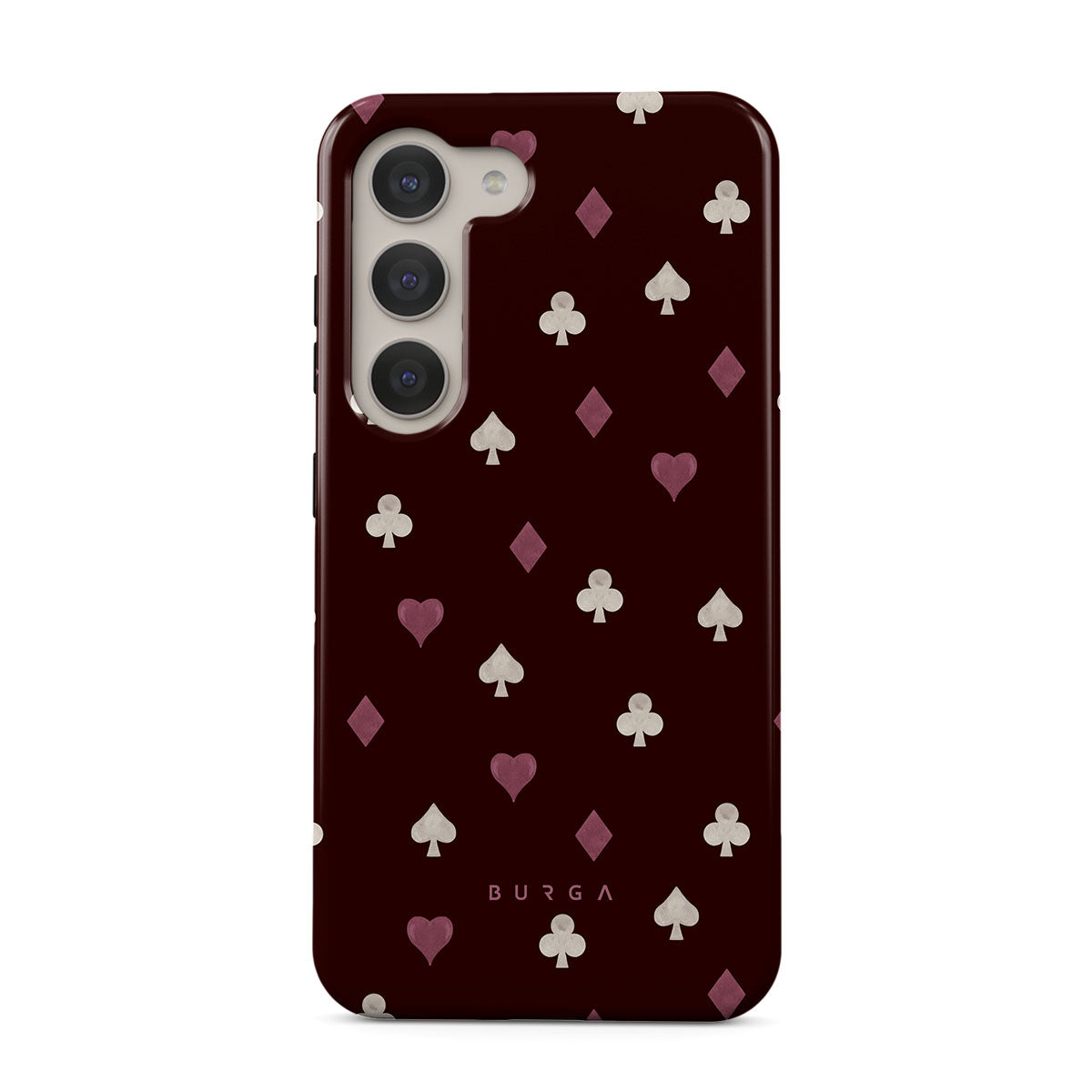 En este diseño: palos de cartas, corazones, picas, diamantes, tréboles, fondo burdeos
