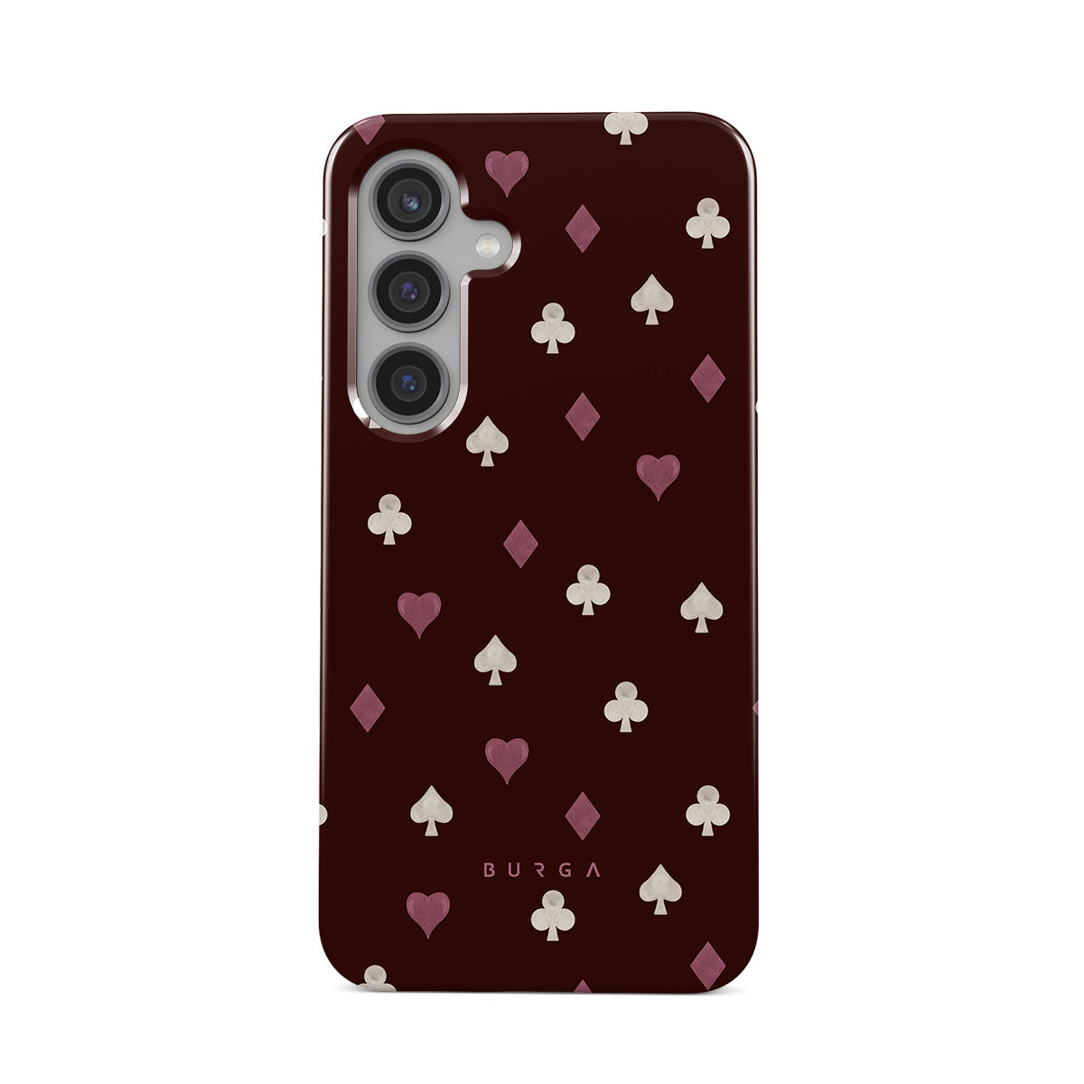 En este diseño: palos de cartas, corazones, picas, diamantes, tréboles, fondo burdeos