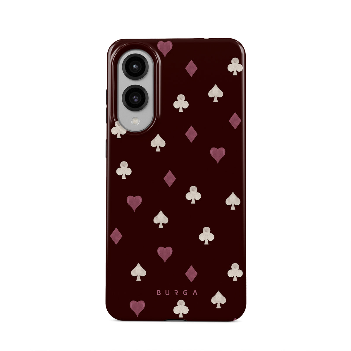 En este diseño: palos de cartas, corazones, picas, diamantes, tréboles, fondo burdeos