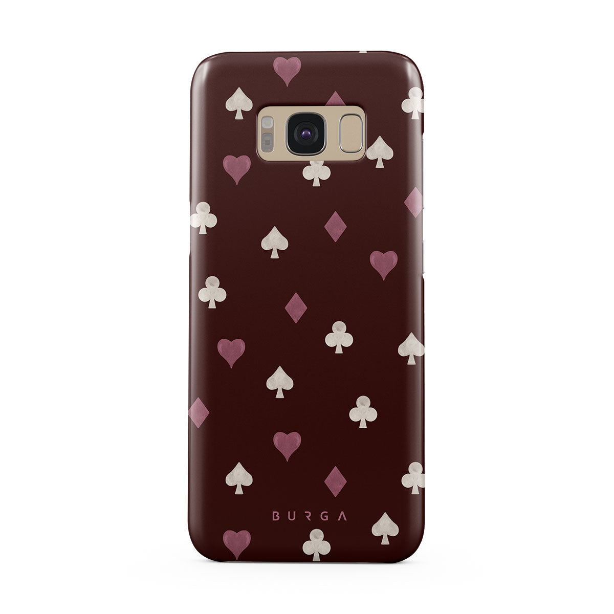 En este diseño: palos de cartas, corazones, picas, diamantes, tréboles, fondo burdeos