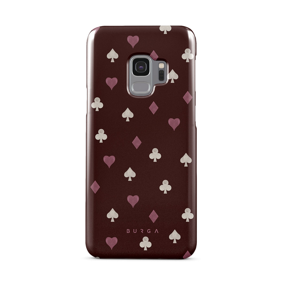 En este diseño: palos de cartas, corazones, picas, diamantes, tréboles, fondo burdeos