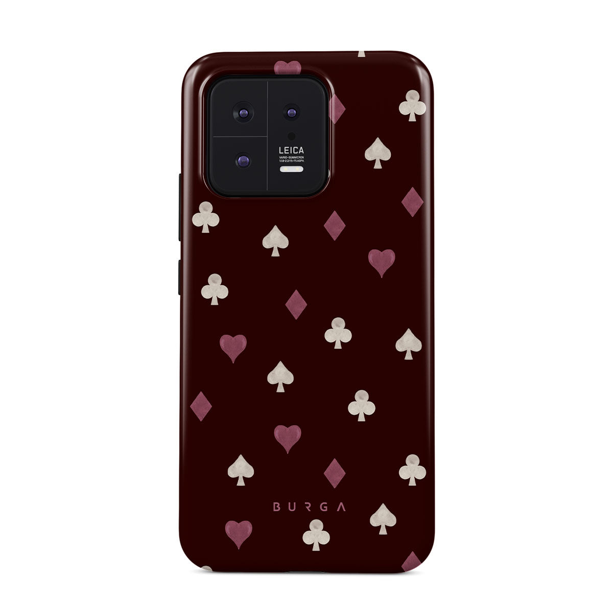 En este diseño: palos de cartas, corazones, picas, diamantes, tréboles, fondo burdeos
