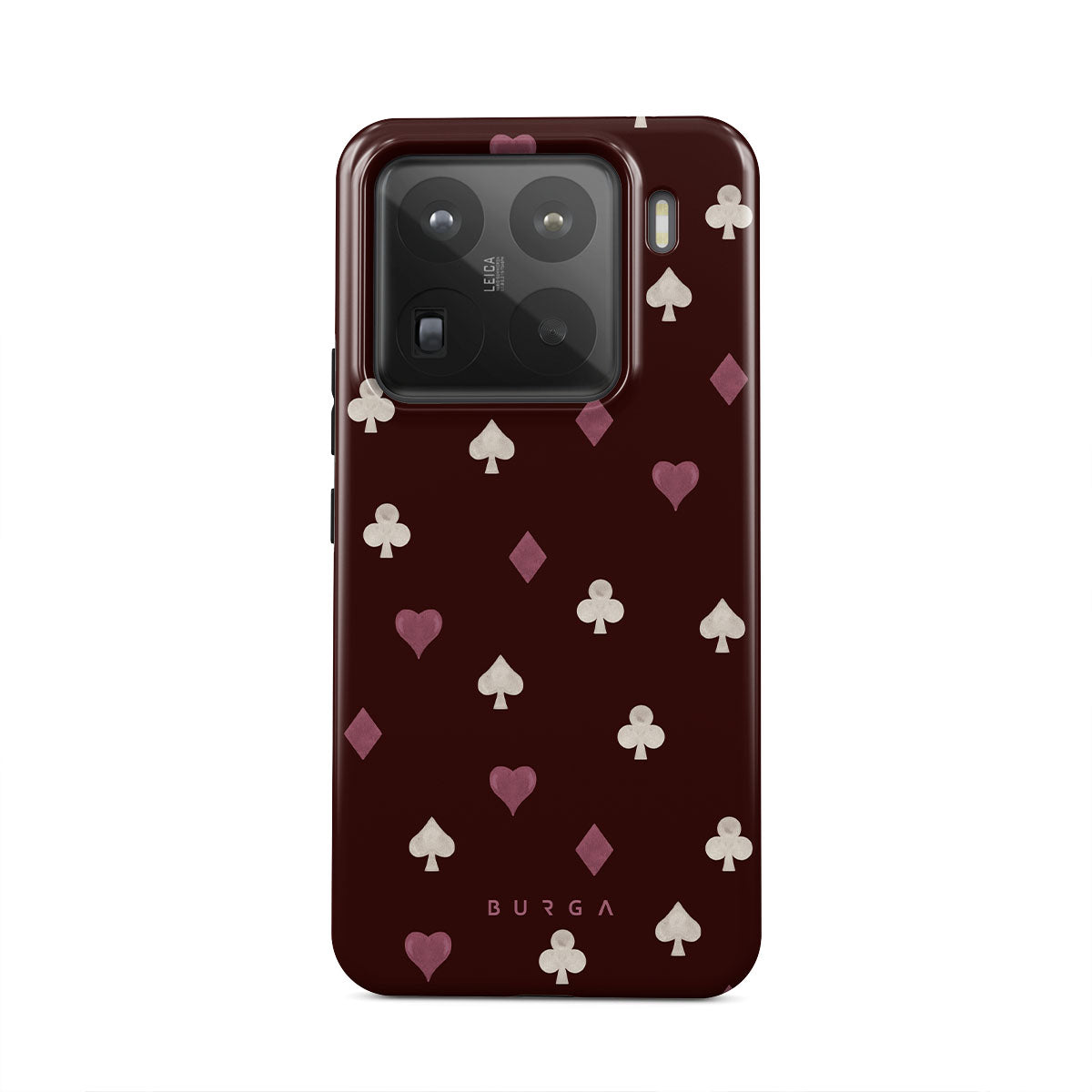 En este diseño: palos de cartas, corazones, picas, diamantes, tréboles, fondo burdeos