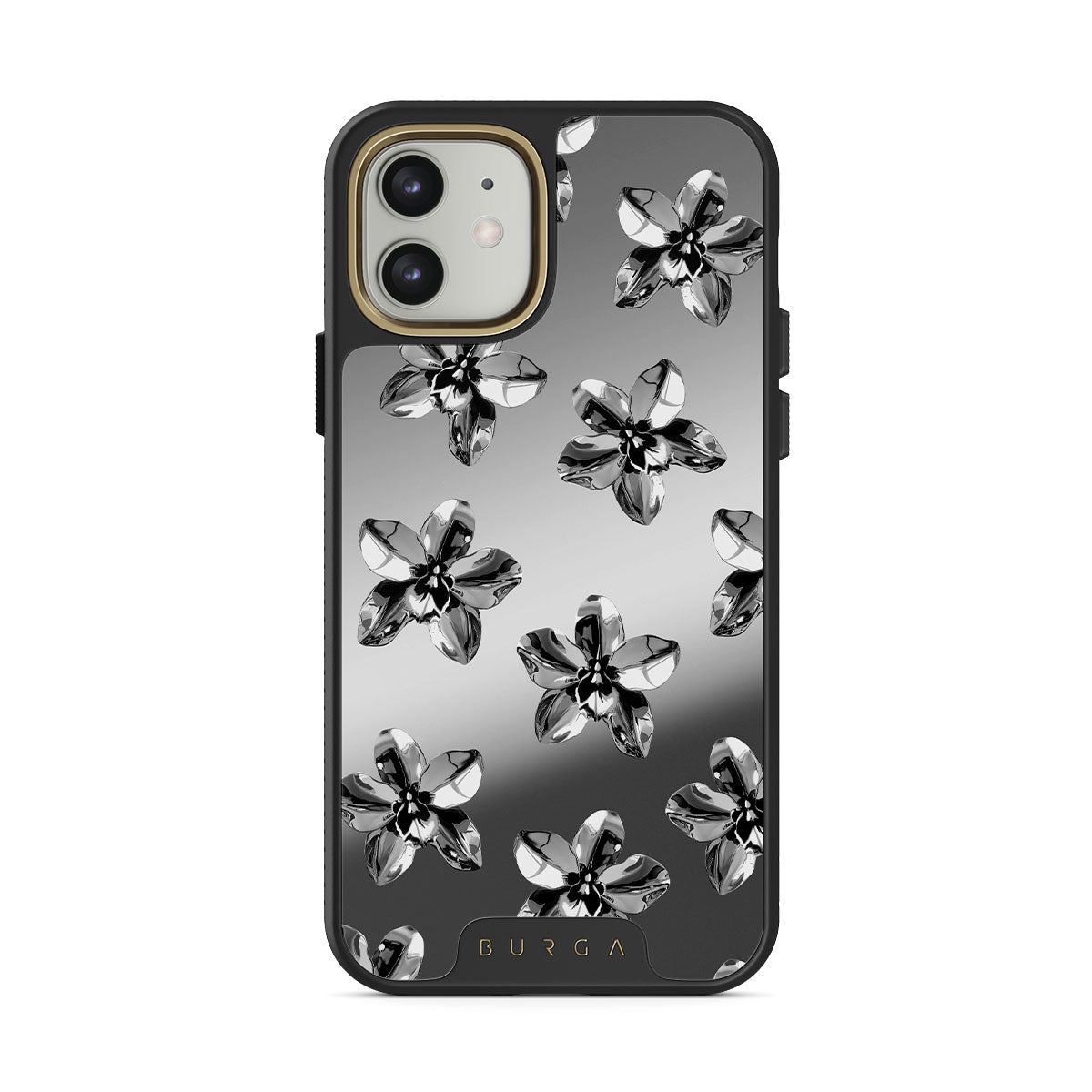 En este diseño: flores plateadas, detalles metálicos, espejo