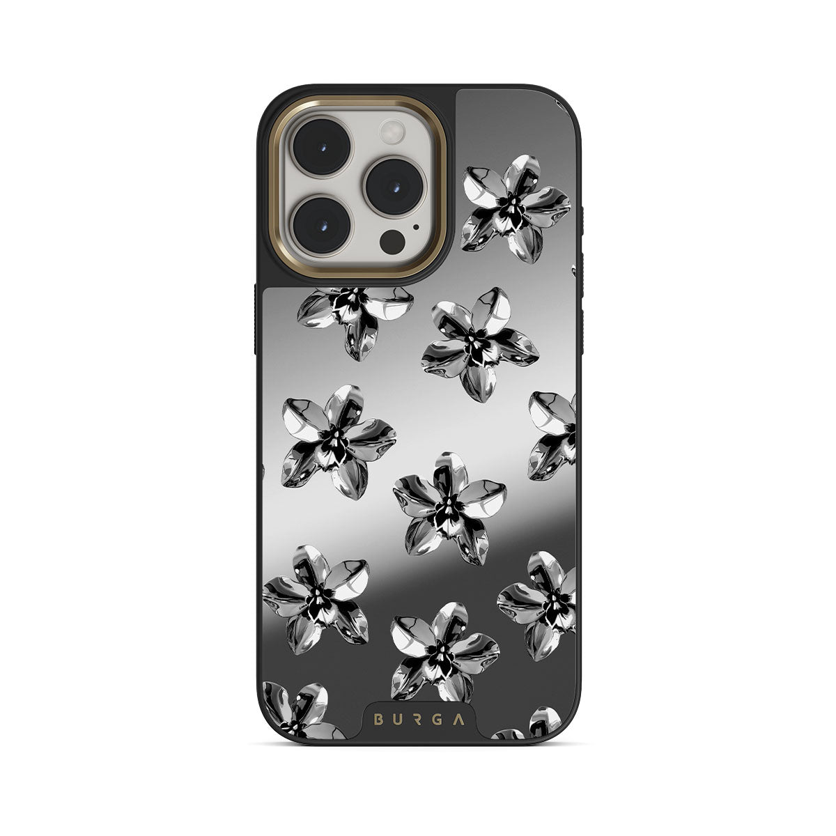 En este diseño: flores plateadas, detalles metálicos, espejo