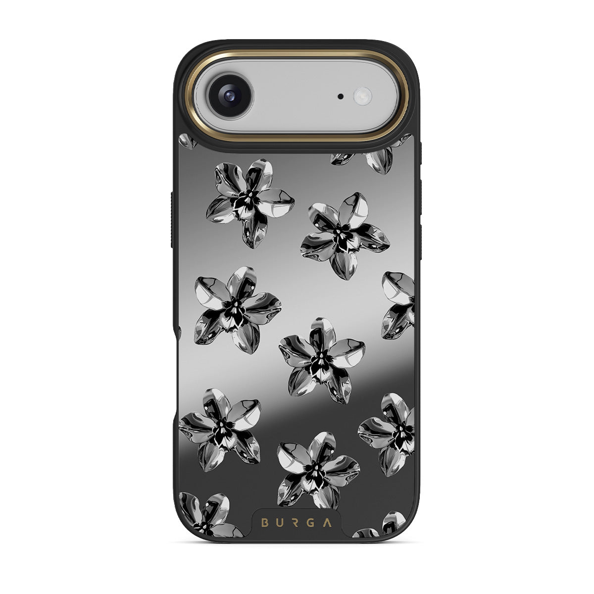 En este diseño: flores plateadas, detalles metálicos, espejo