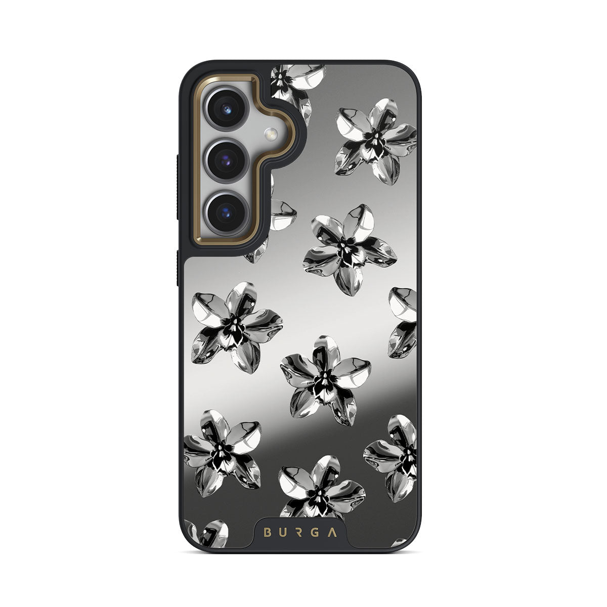En este diseño: flores plateadas, detalles metálicos, espejo