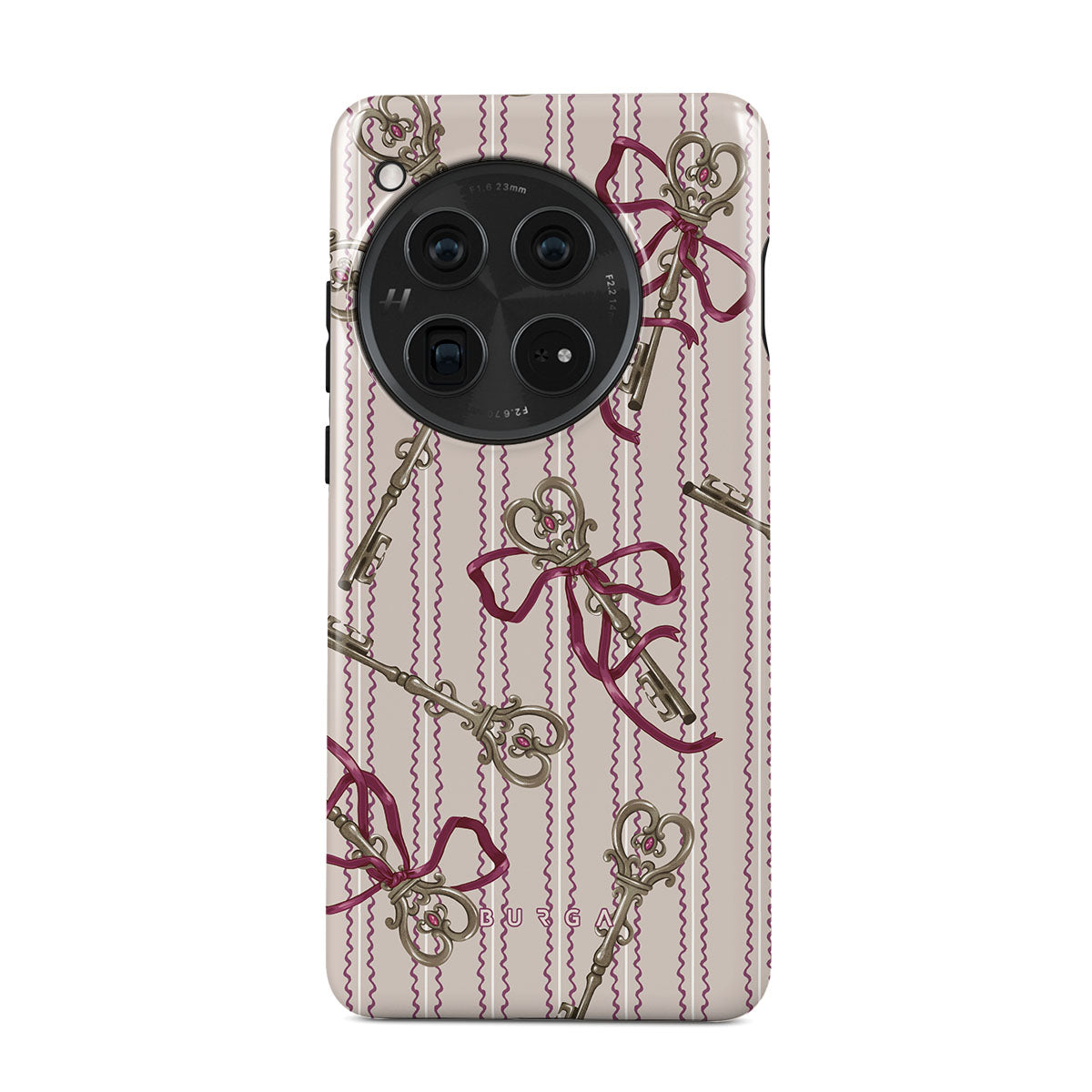 En este diseño: llaves antiguas, lazos, cintas rosas, fondo a rayas