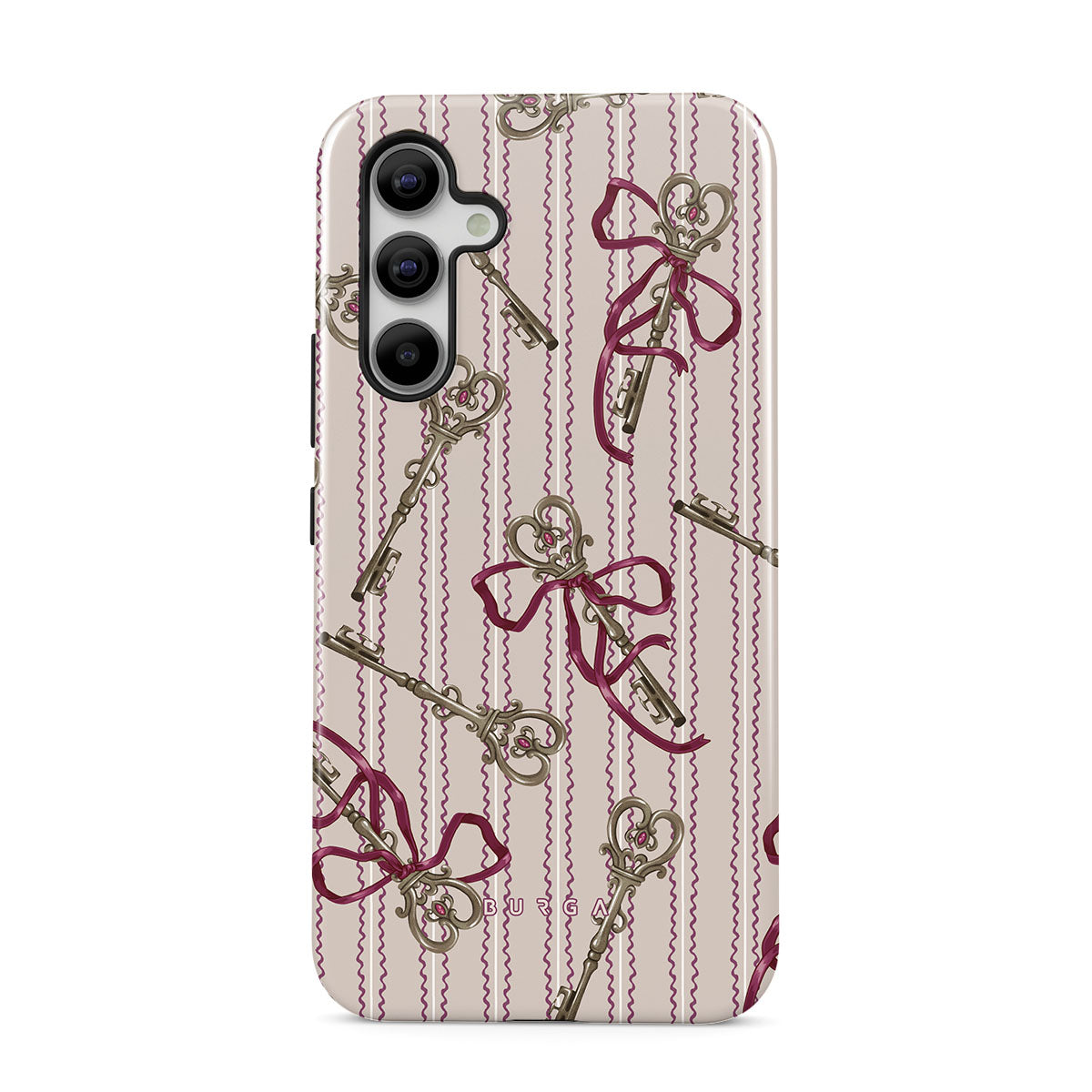En este diseño: llaves antiguas, lazos, cintas rosas, fondo a rayas