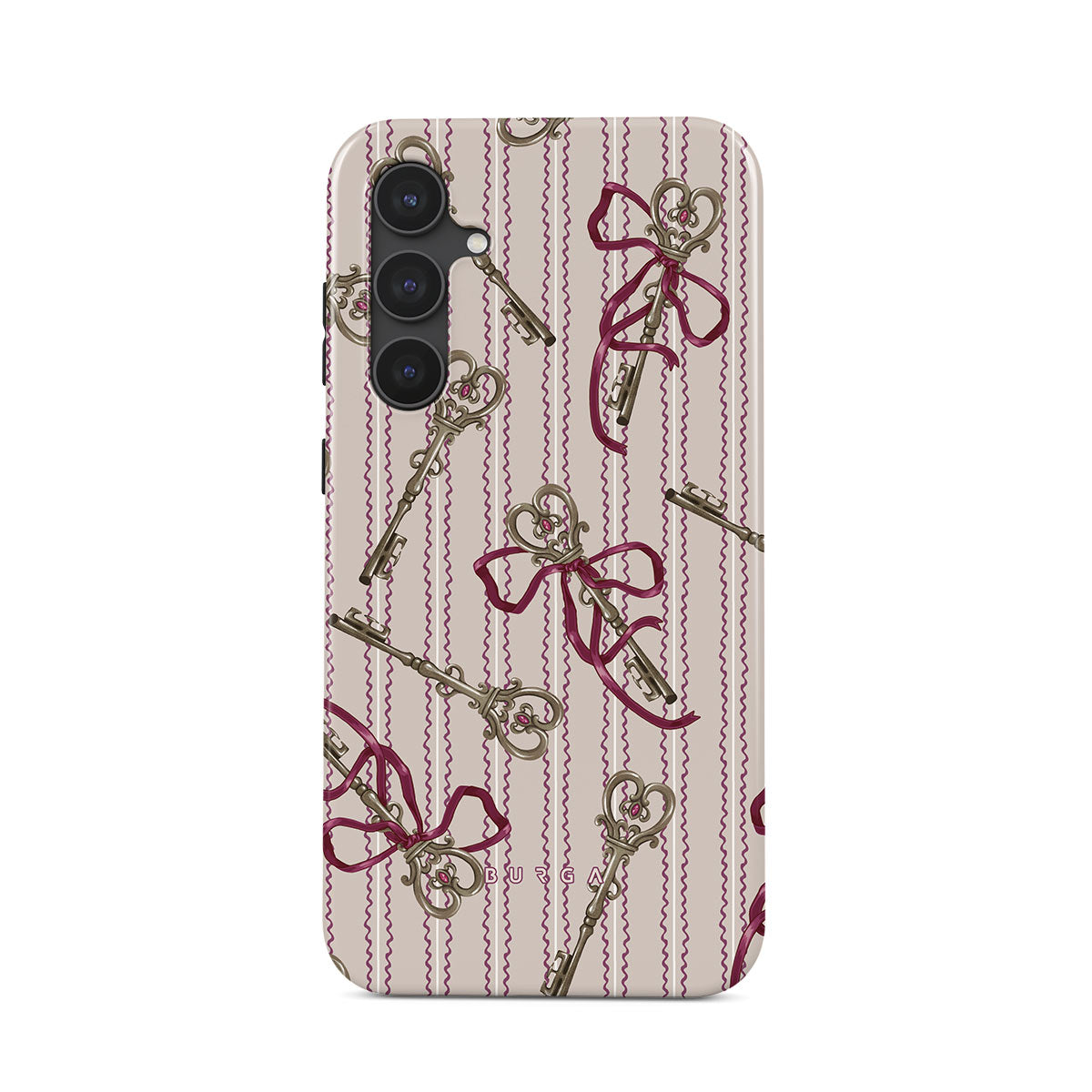 En este diseño: llaves antiguas, lazos, cintas rosas, fondo a rayas
