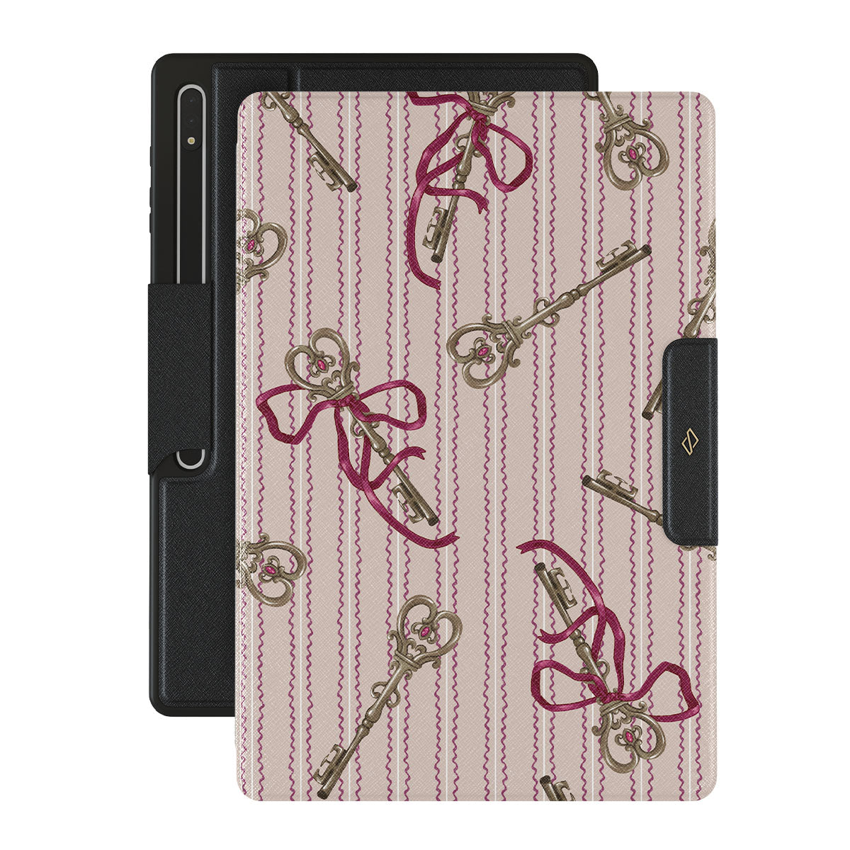 En este diseño: llaves antiguas, lazos, cintas rosas, fondo a rayas