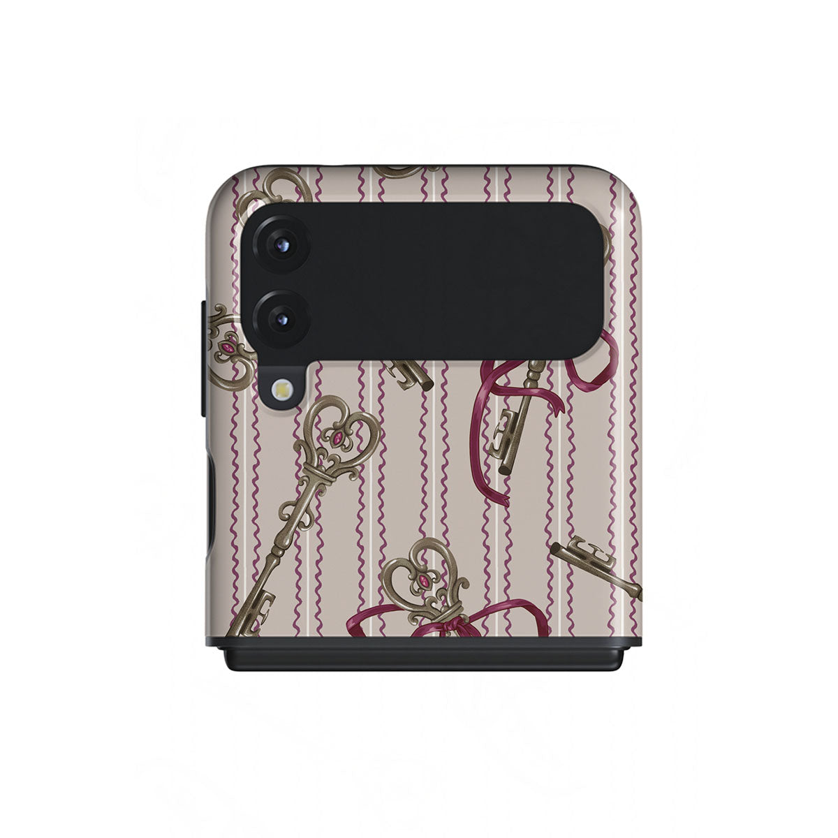 En este diseño: llaves antiguas, lazos, cintas rosas, fondo a rayas