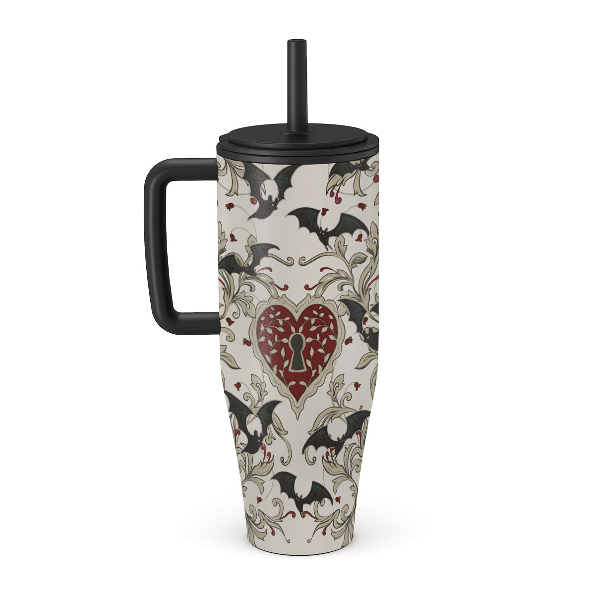 En este diseño: corazón, candado, murciélagos, motivos góticos