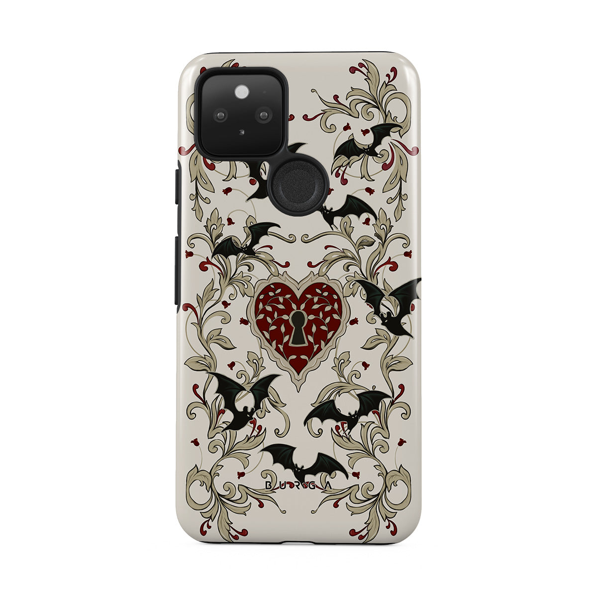 En este diseño: corazón, candado, murciélagos, motivos góticos
