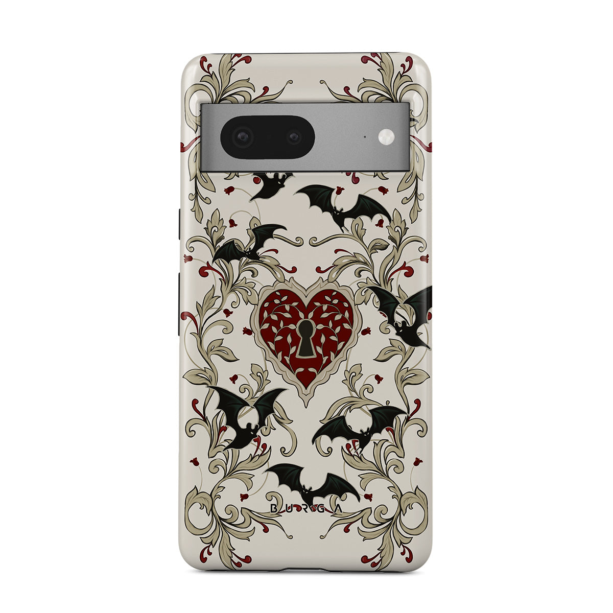 En este diseño: corazón, candado, murciélagos, motivos góticos