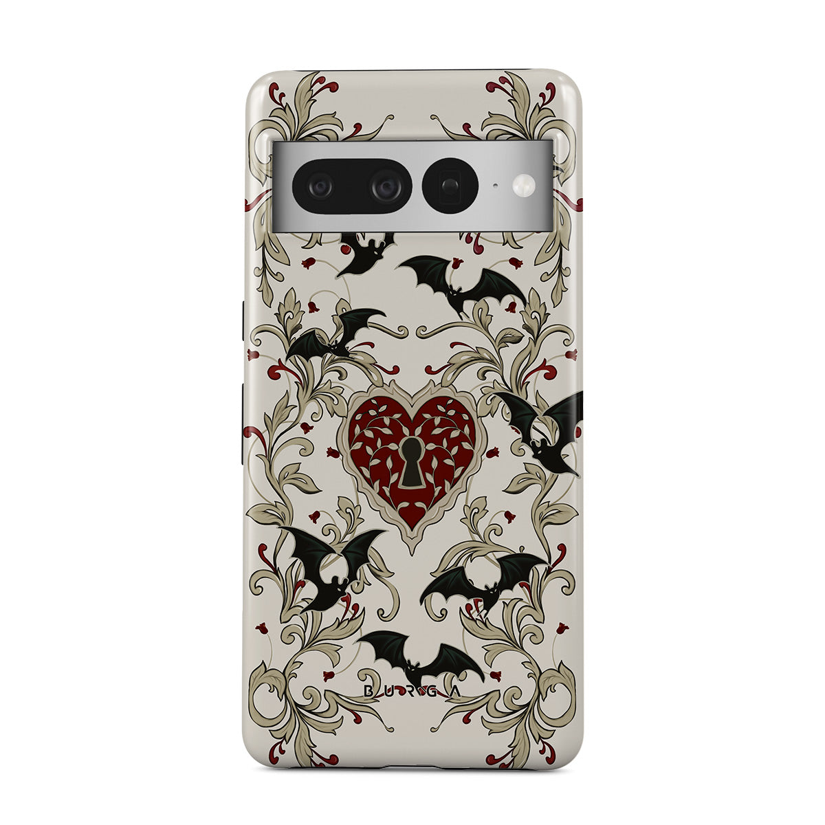 En este diseño: corazón, candado, murciélagos, motivos góticos