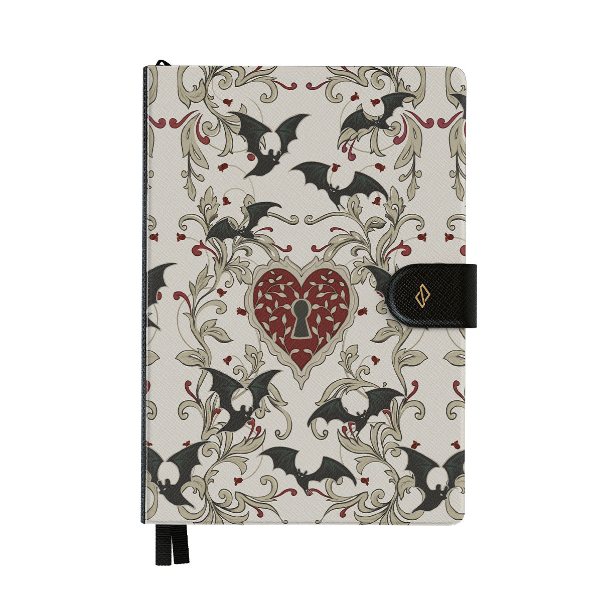 En este diseño: corazón, candado, murciélagos, motivos góticos