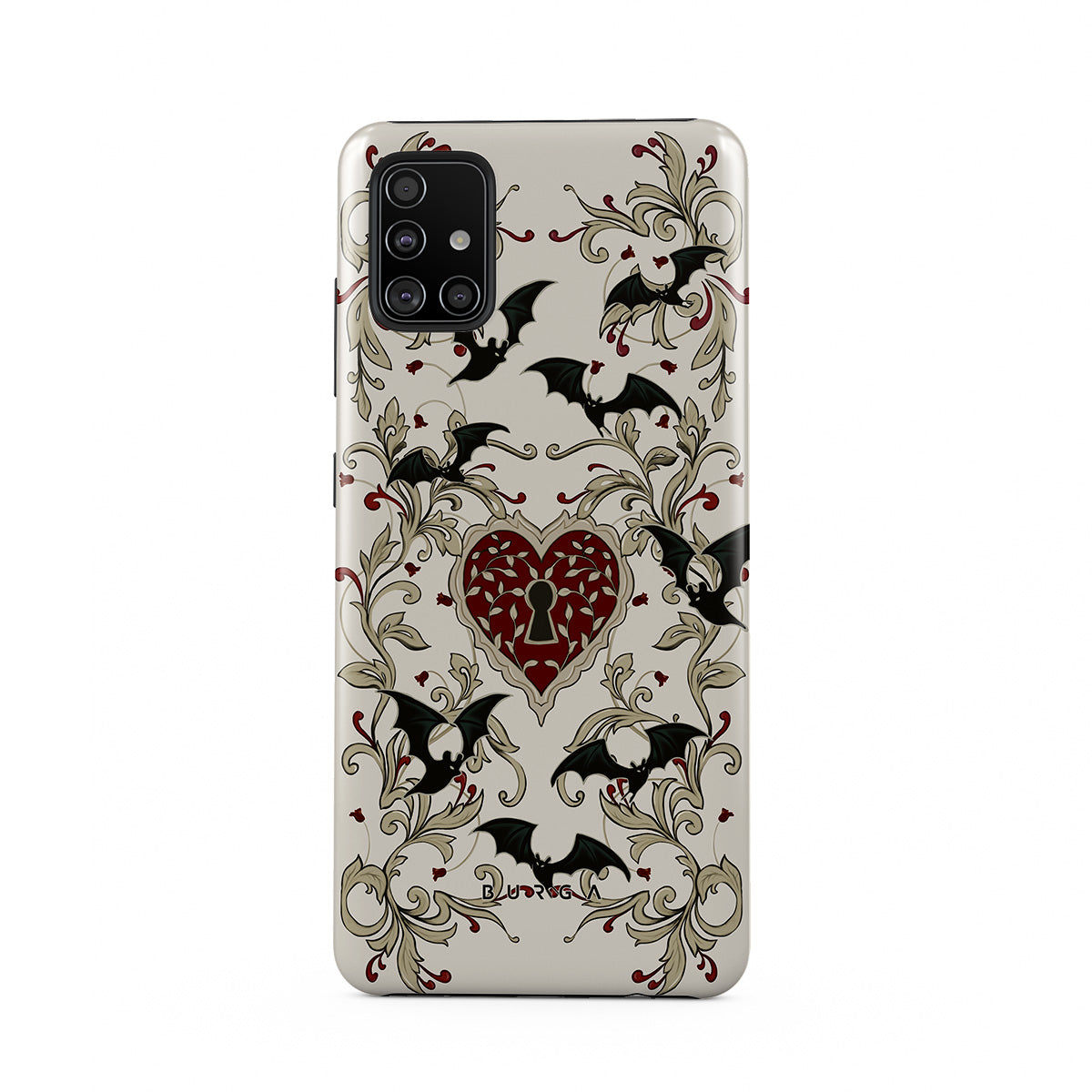En este diseño: corazón, candado, murciélagos, motivos góticos