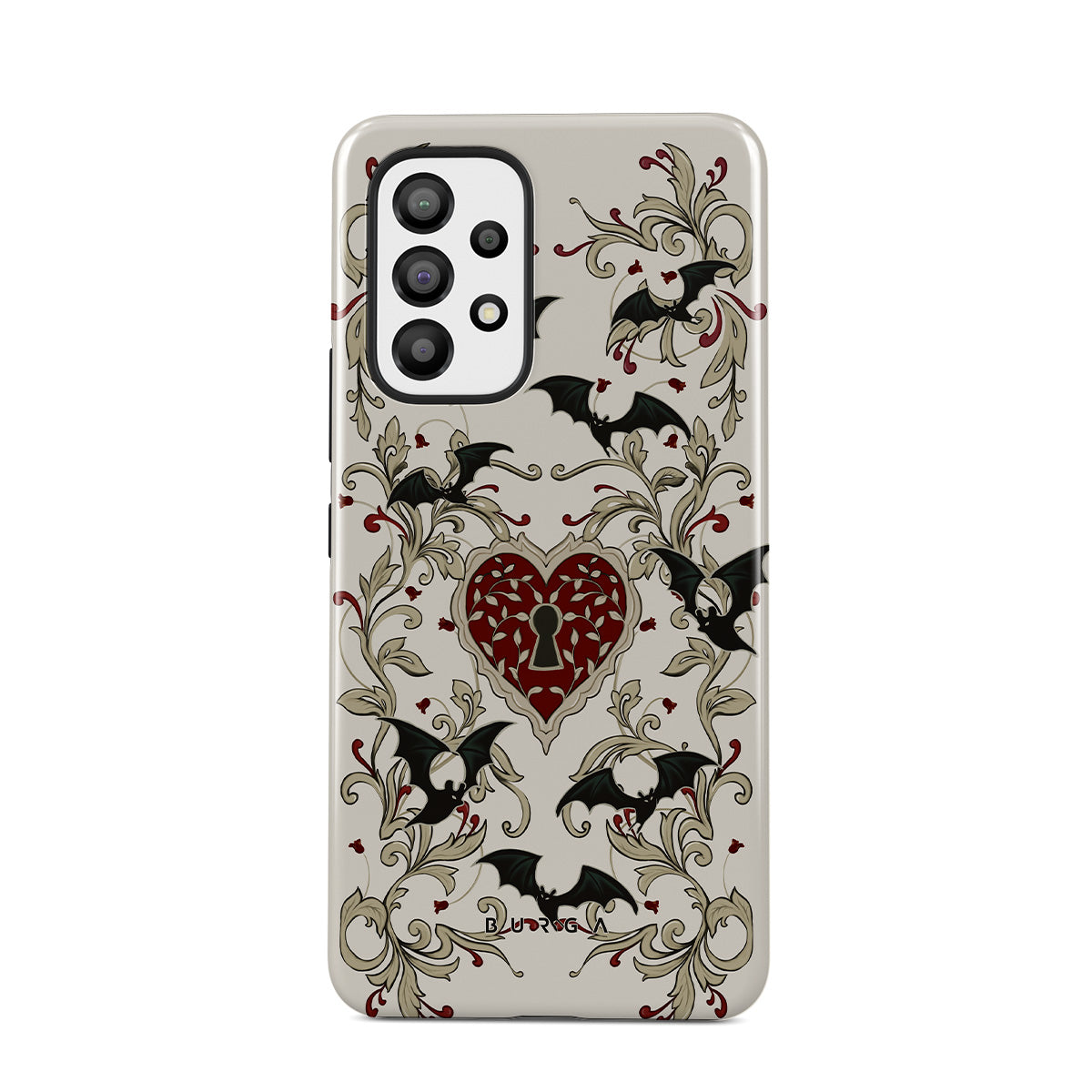 En este diseño: corazón, candado, murciélagos, motivos góticos