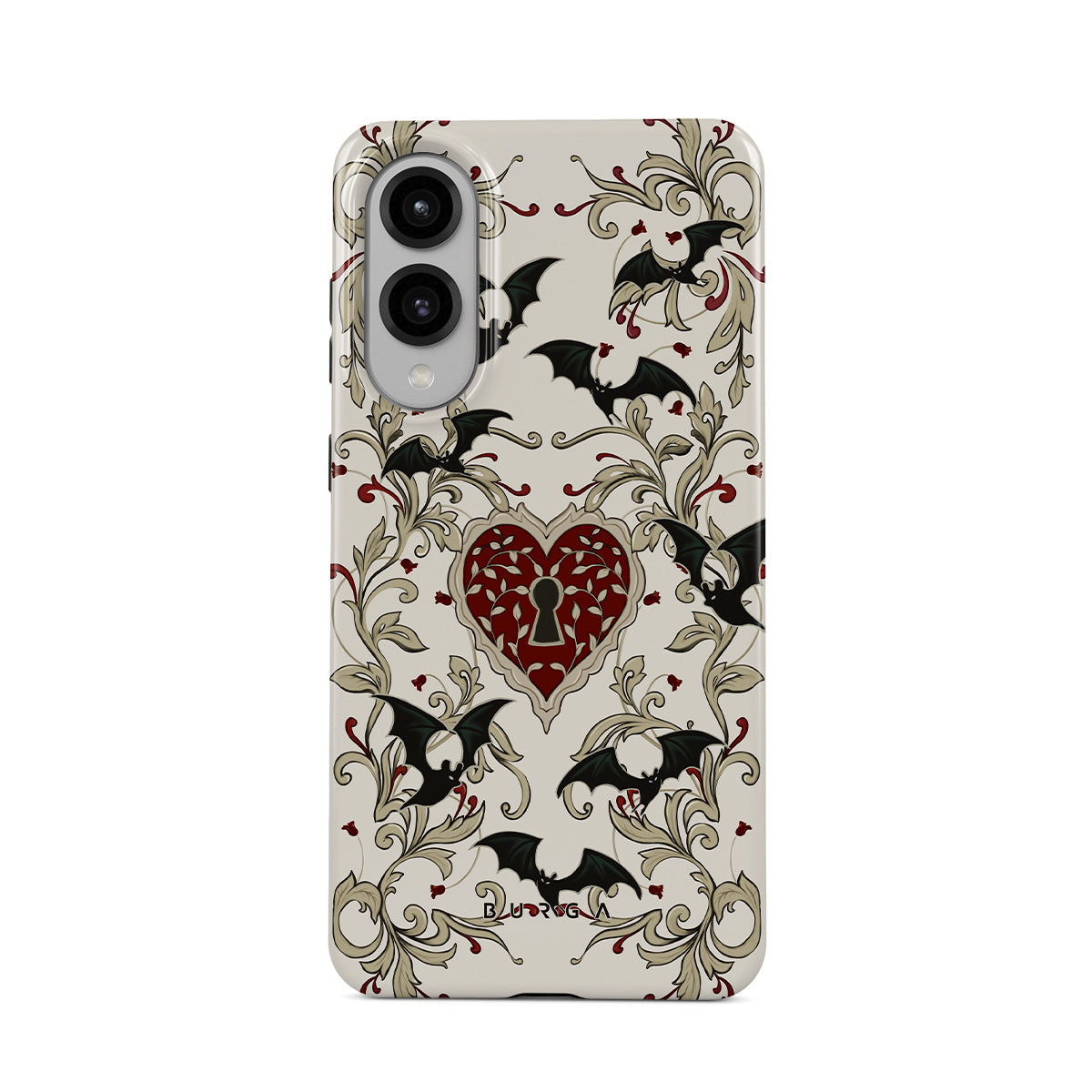 En este diseño: corazón, candado, murciélagos, motivos góticos